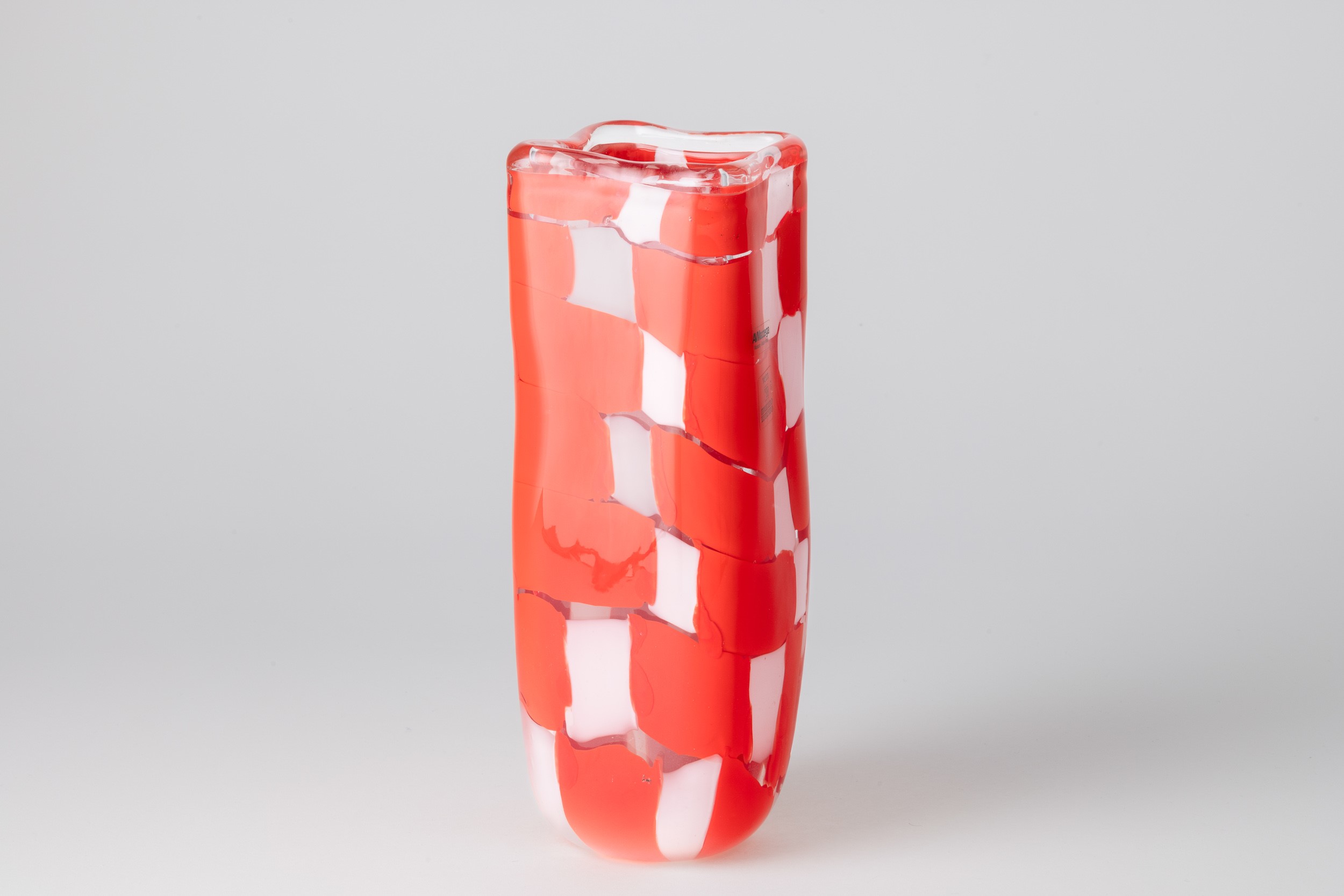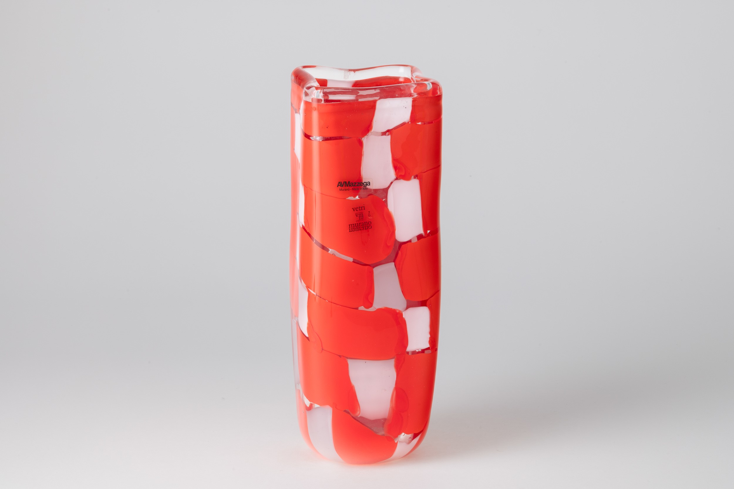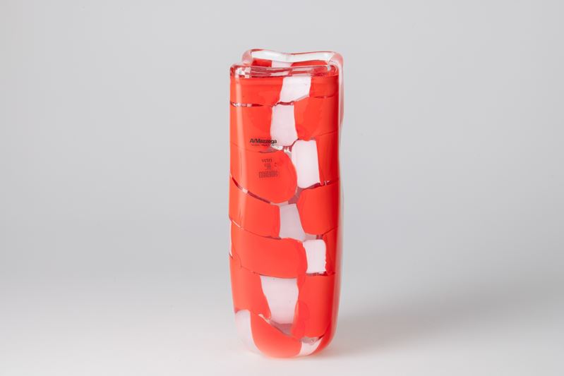 Vaso a sezione quadrata in vetro pesante con decoro di tessere policrome sommerse.