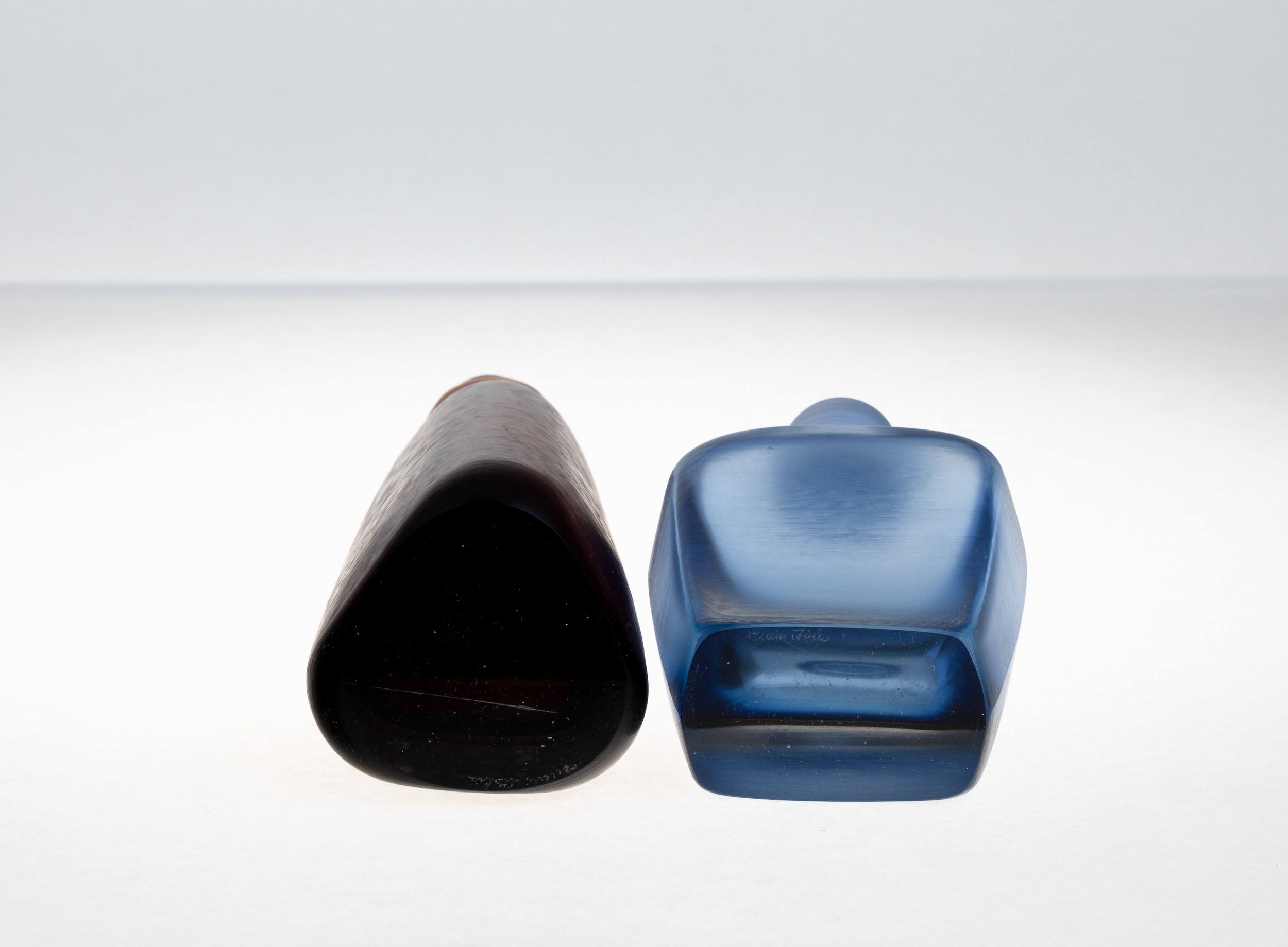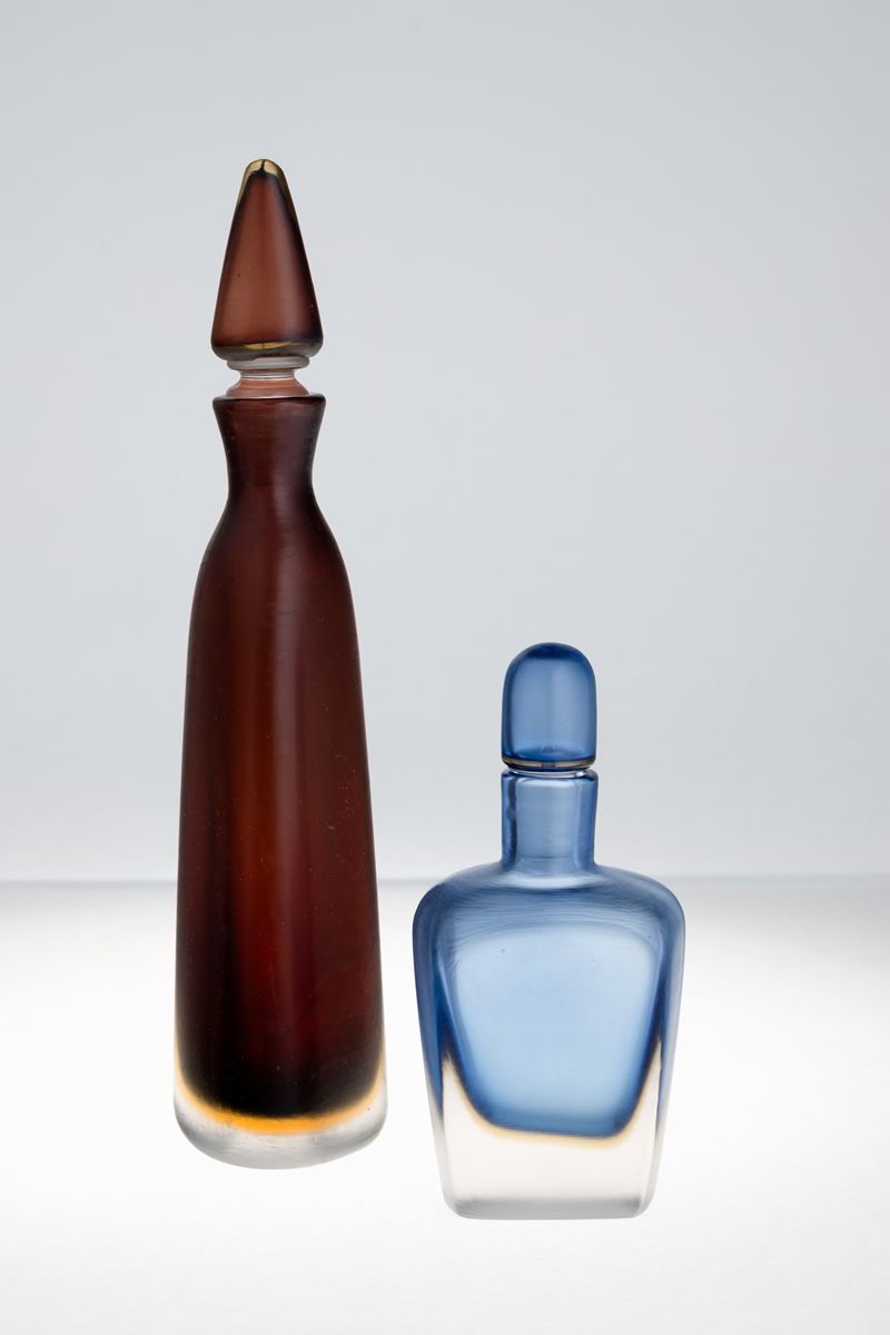 Due bottiglie serie Incisi in vetro sommerso adriatico e giallo tè con superficie interamente lavorata alla mola.