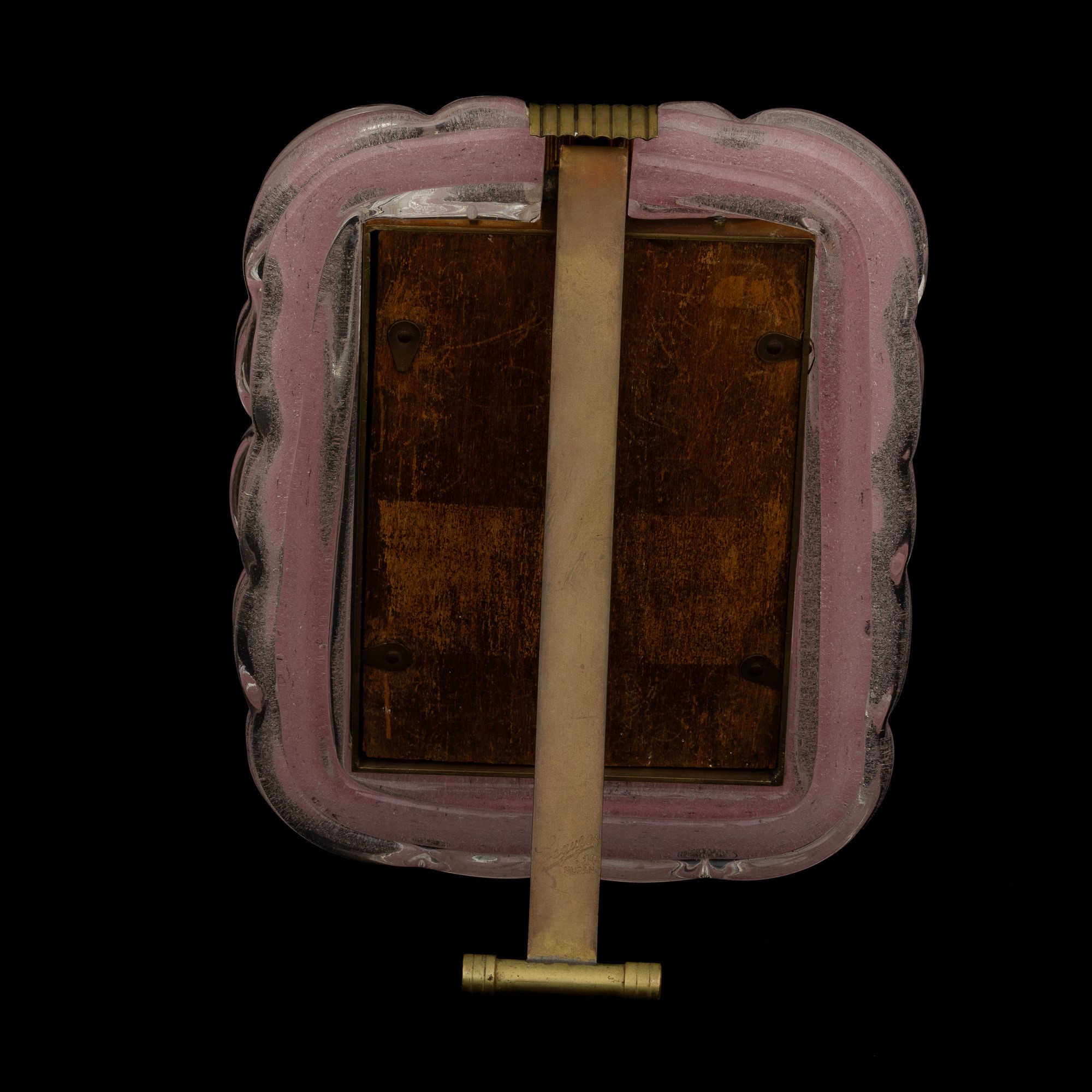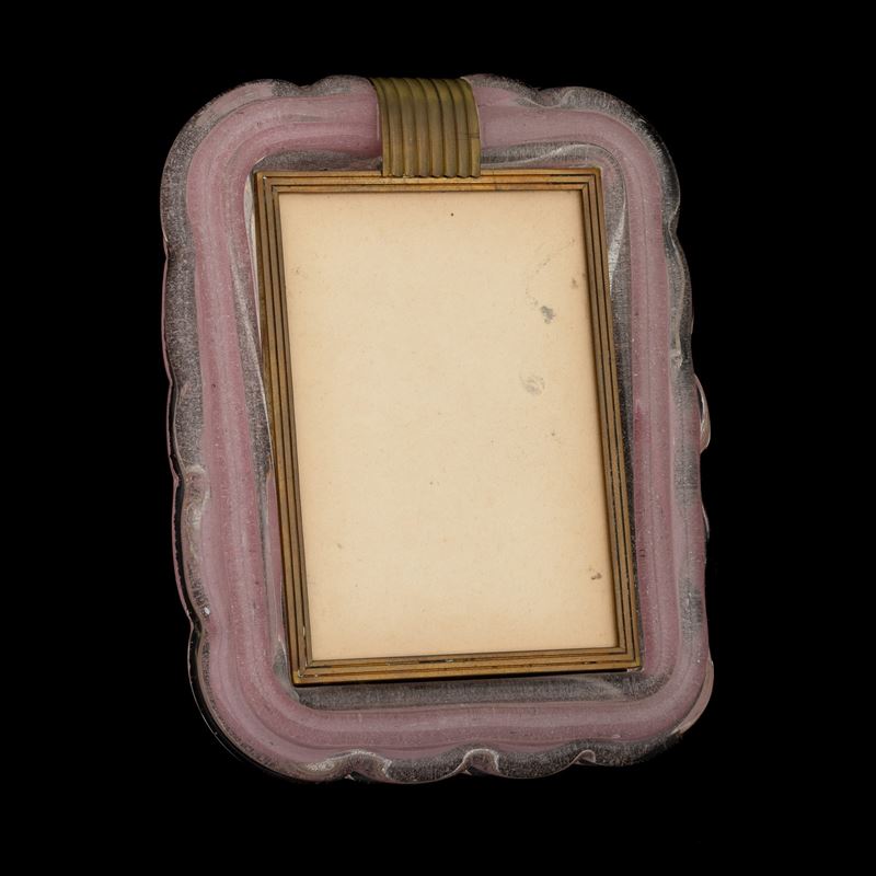 Raro portaritratti in ottone con cornice sagomata in vetro sommerso a bollicine e canne rosate.