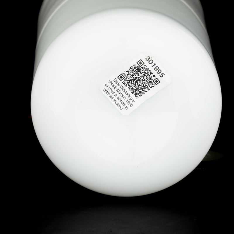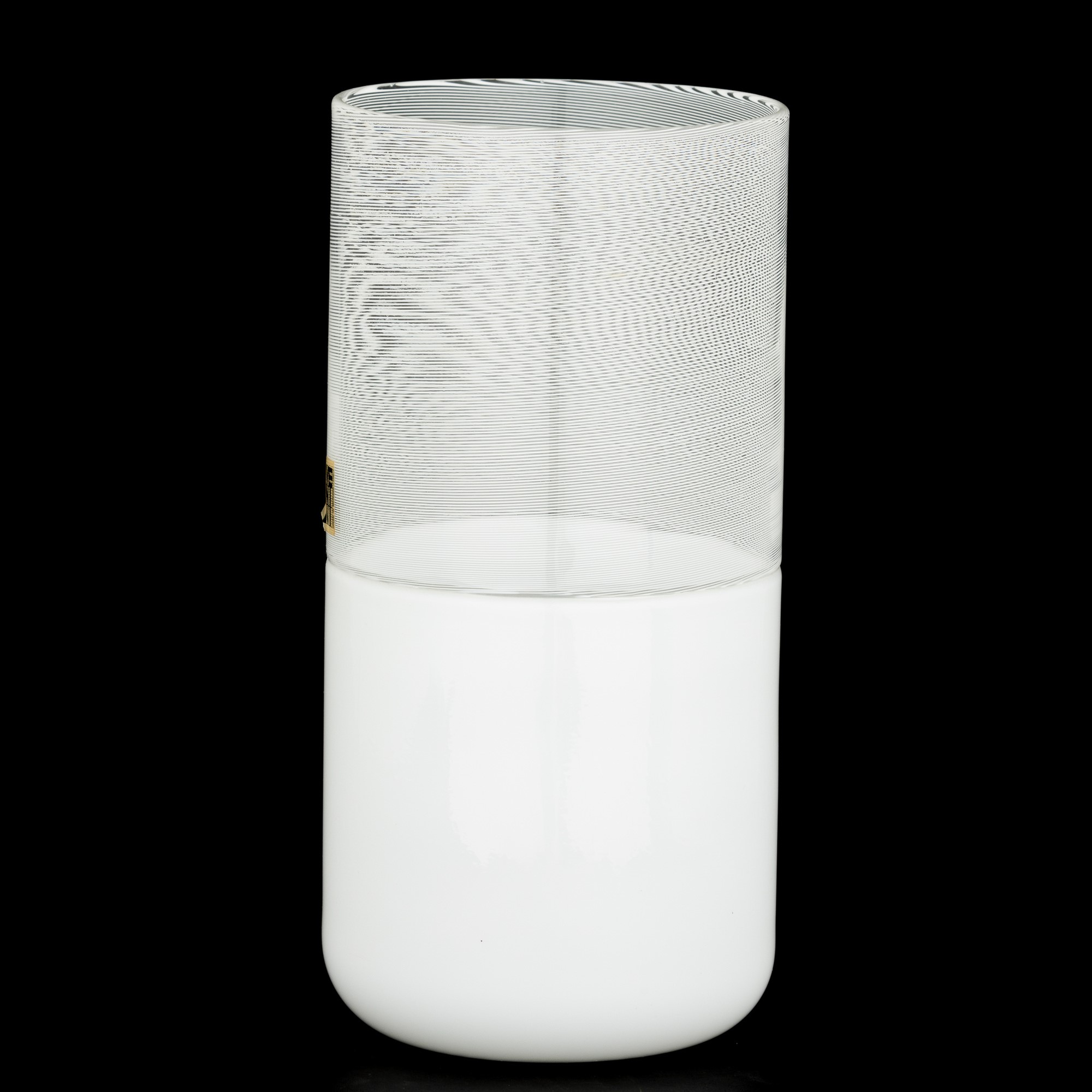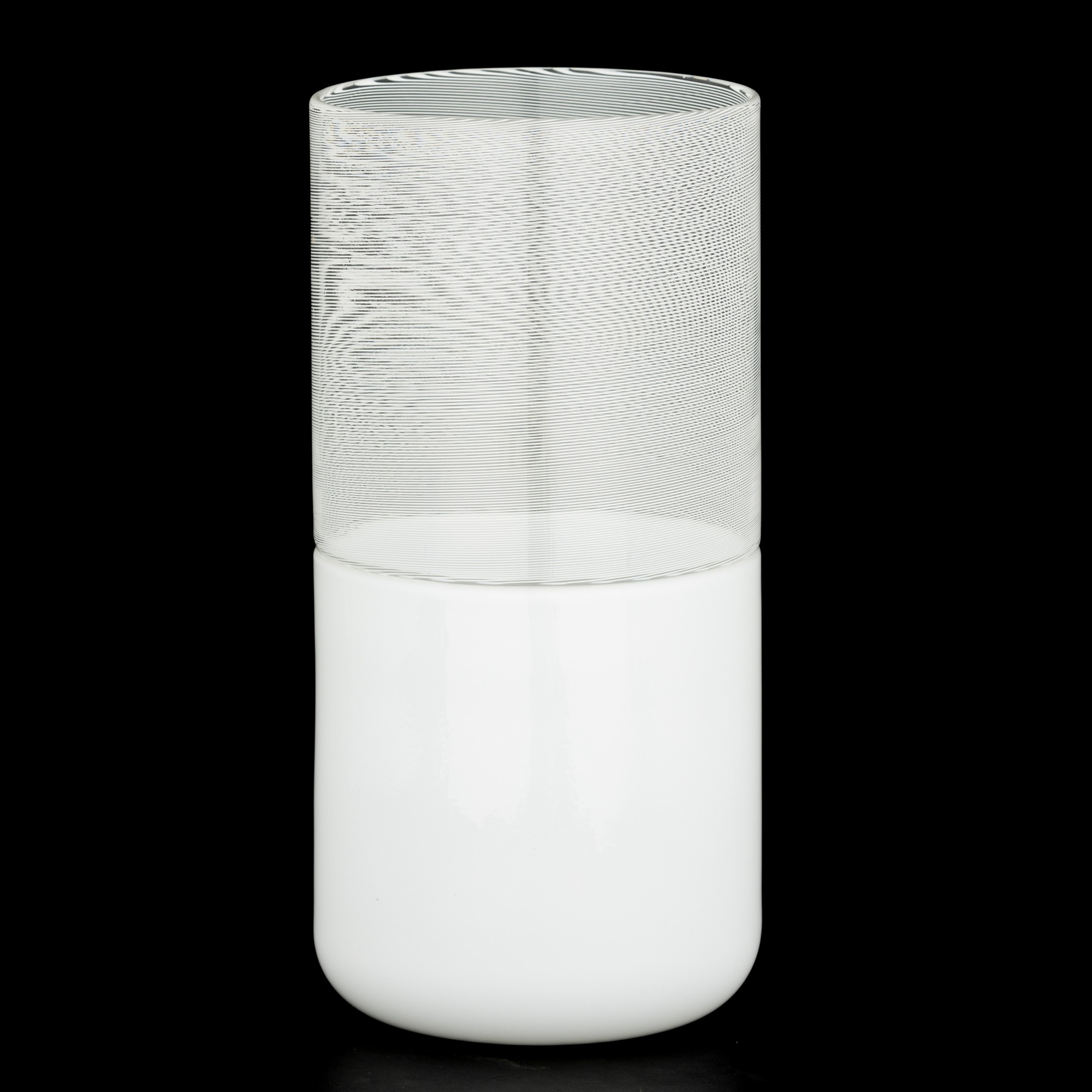Vaso serie Filigrane di Tapio di forma cilindrica in vetro soffiato a filigrana e lattimo.