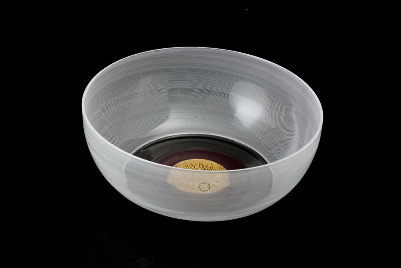 Coppa serie Inari in vetro soffiato a fasce policrome e filigrana incalmate. Fondo con decoro in foglia oro sommersa.