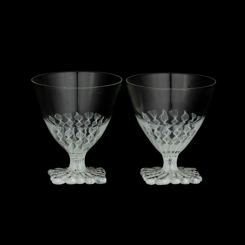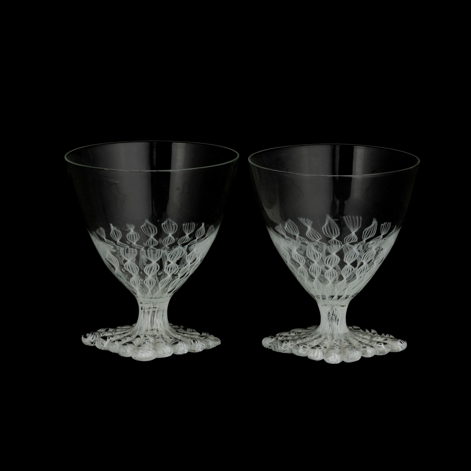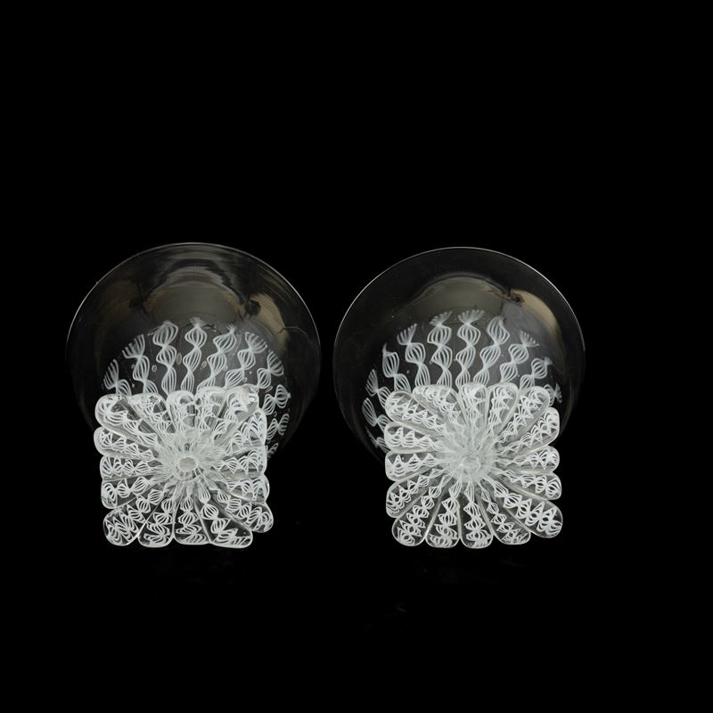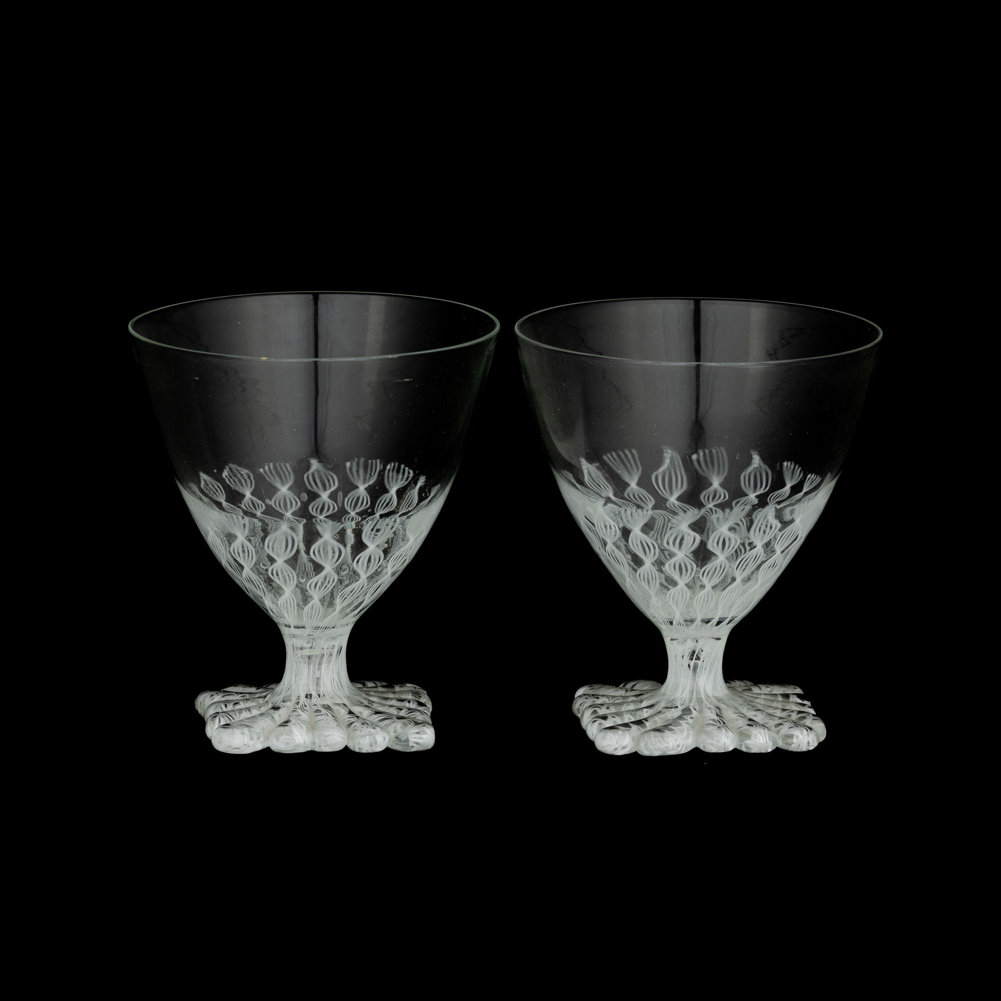 Rara coppia di bicchieri in vetro soffiato a piede quadrato con decoro di canne lattimo zanfirico.