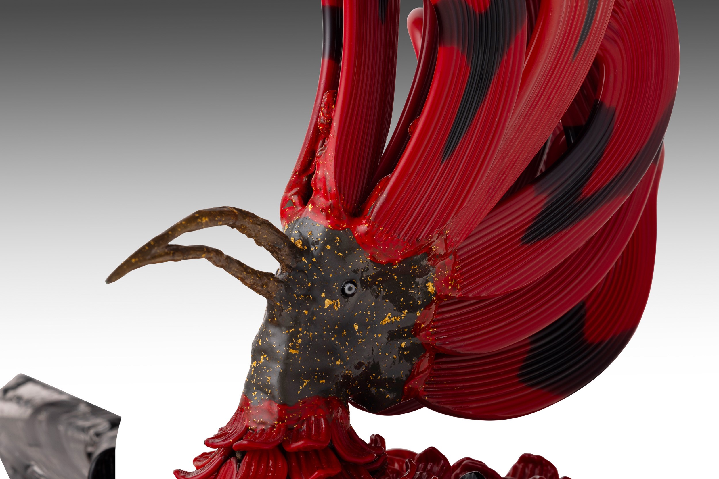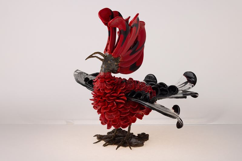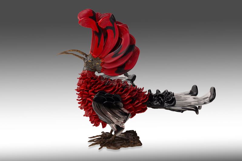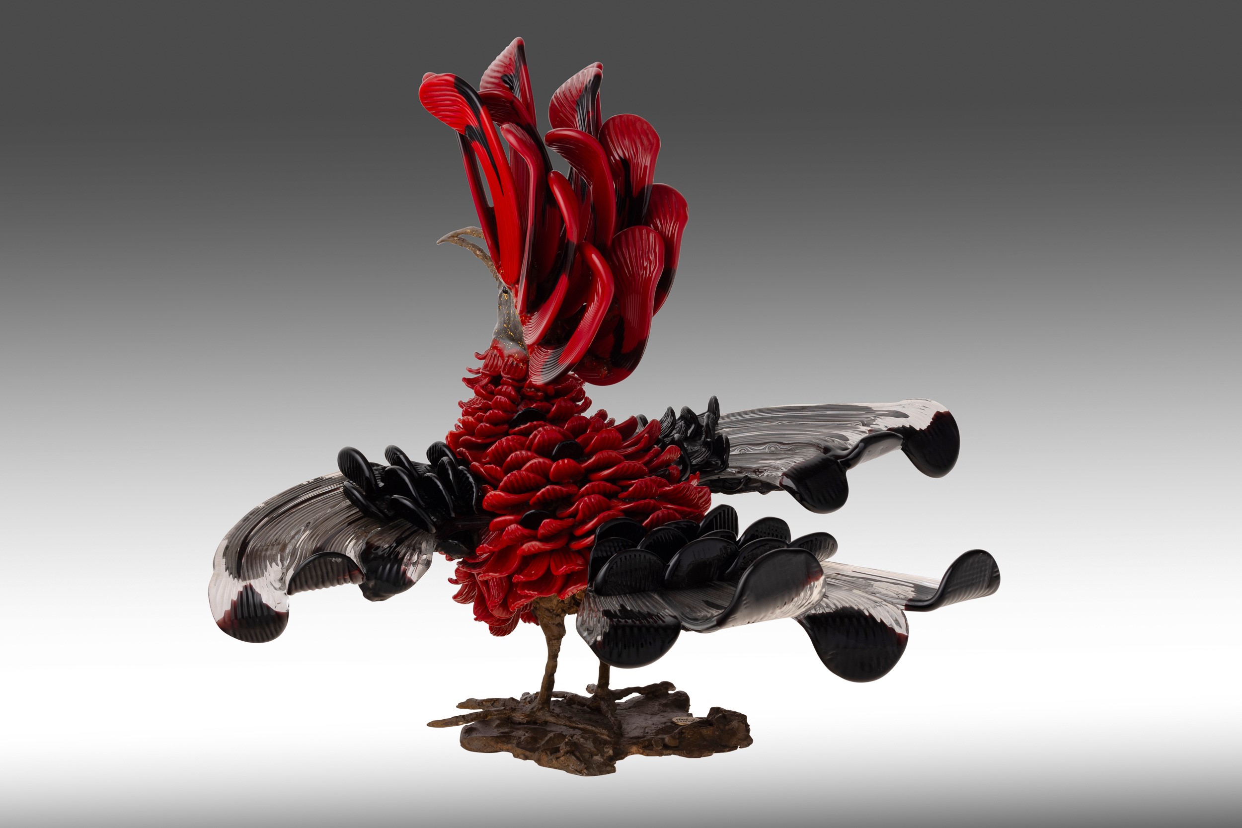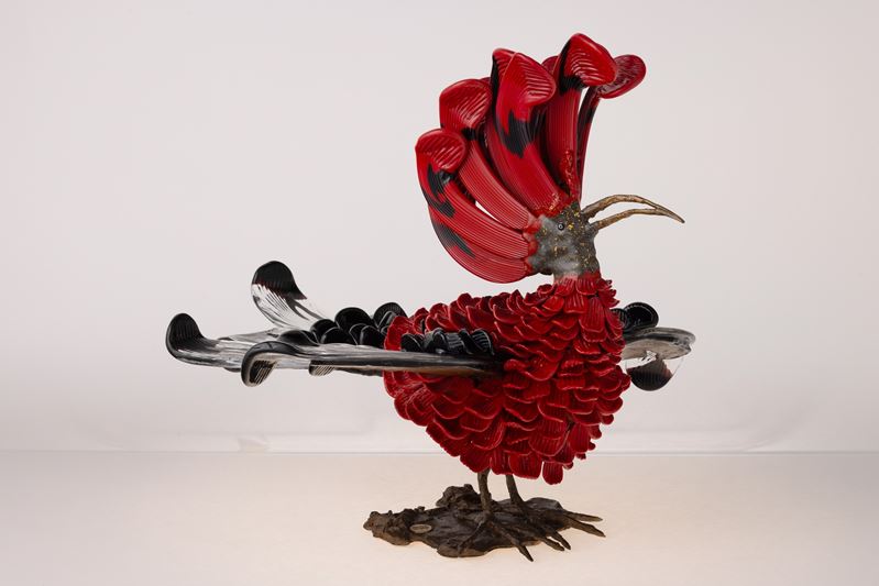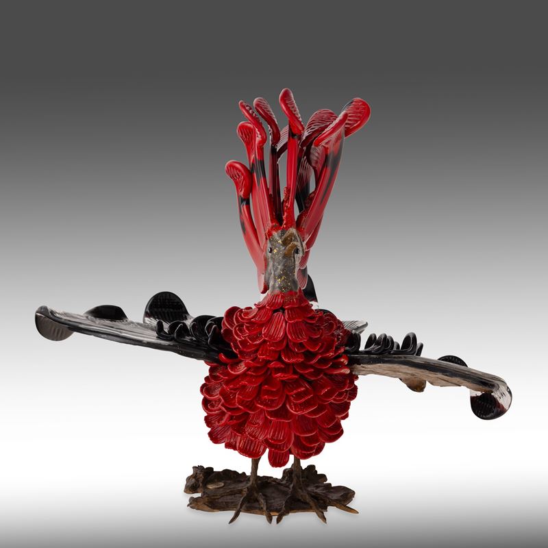 Scultura raffigurante upupa in bronzo patinato con decoro di piume applicate in vetro lavorato a caldo rosso corallo, nero e cristallo.