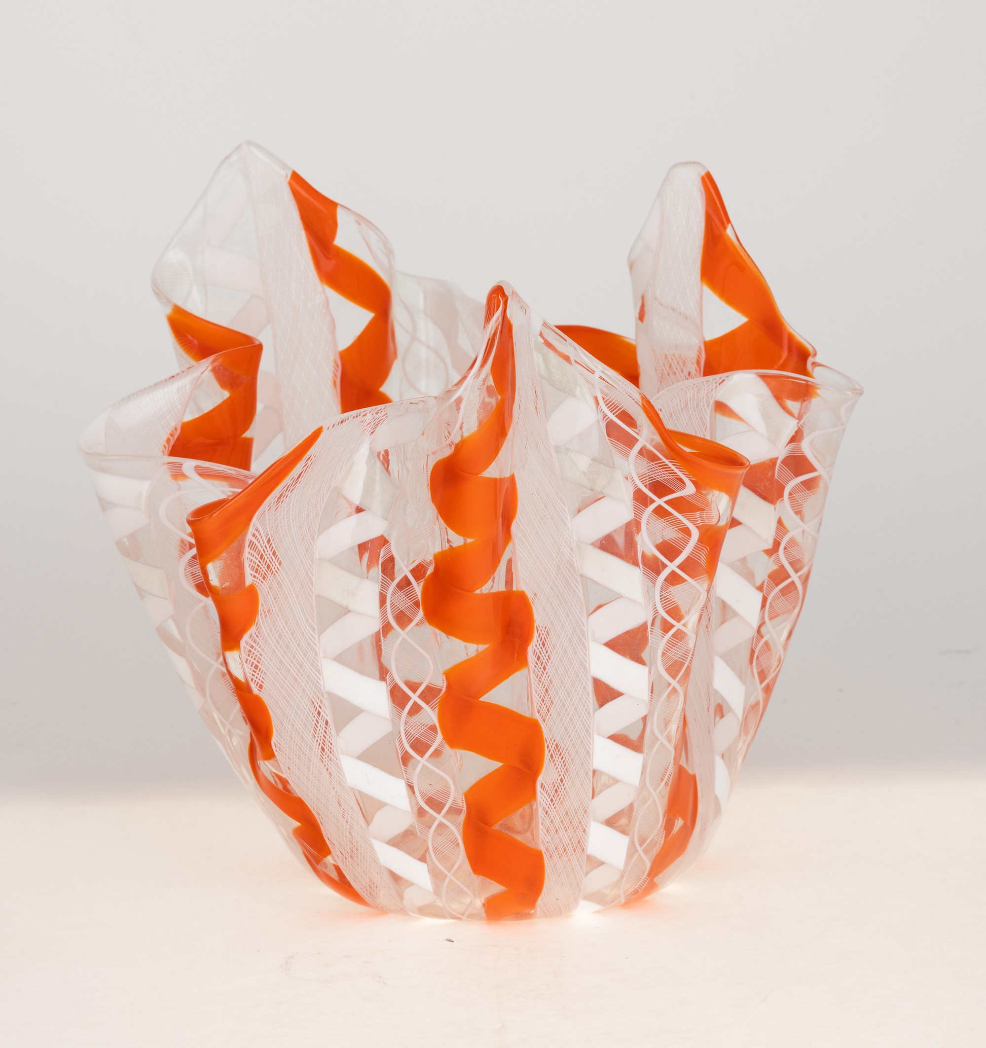 Vaso Fazzoletto in vetro soffiato con decoro di canne zanfirico e filigrana lattimo, rosa e arancio.