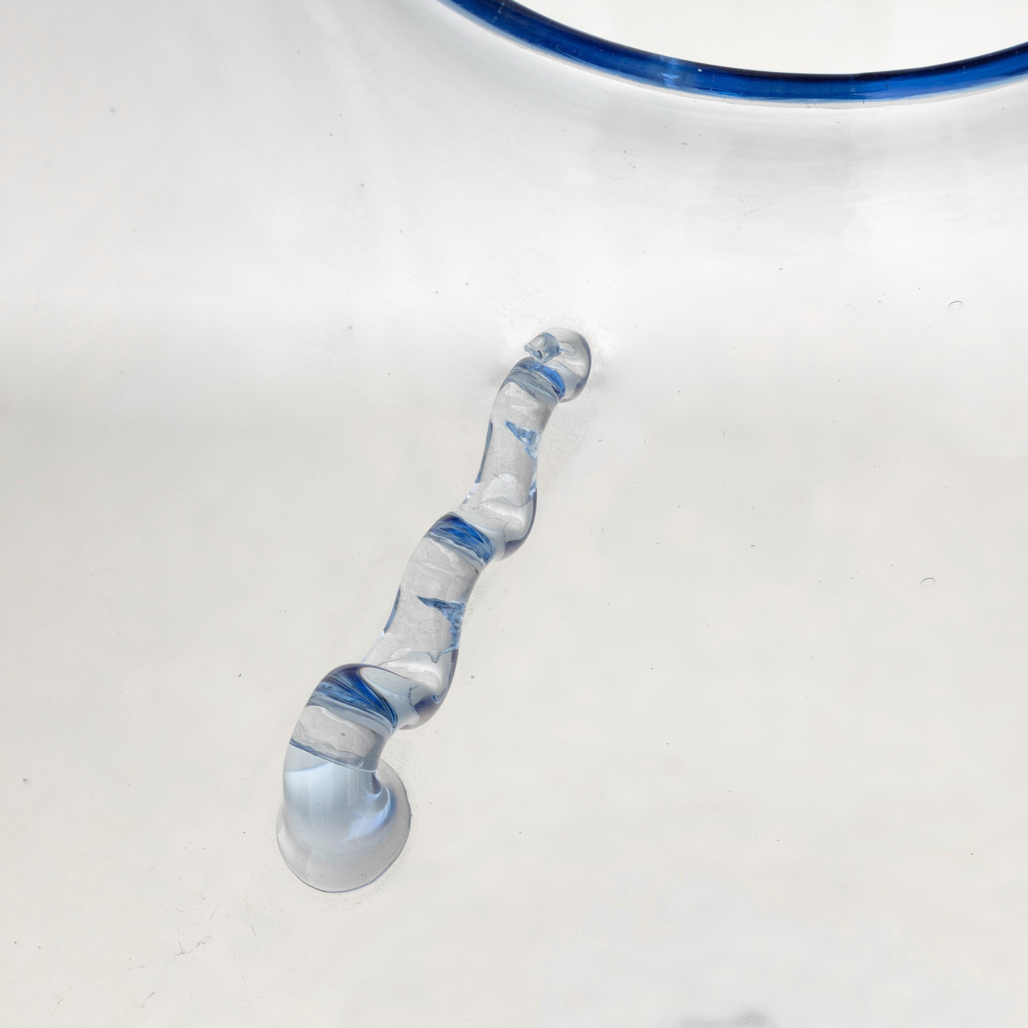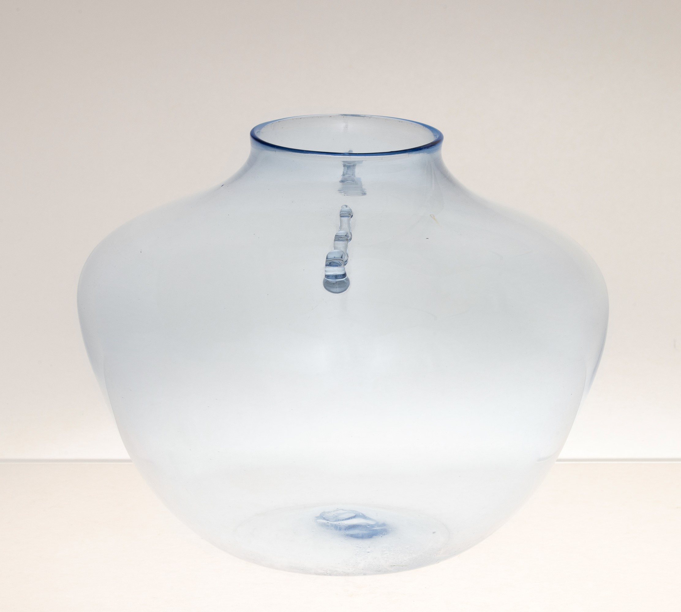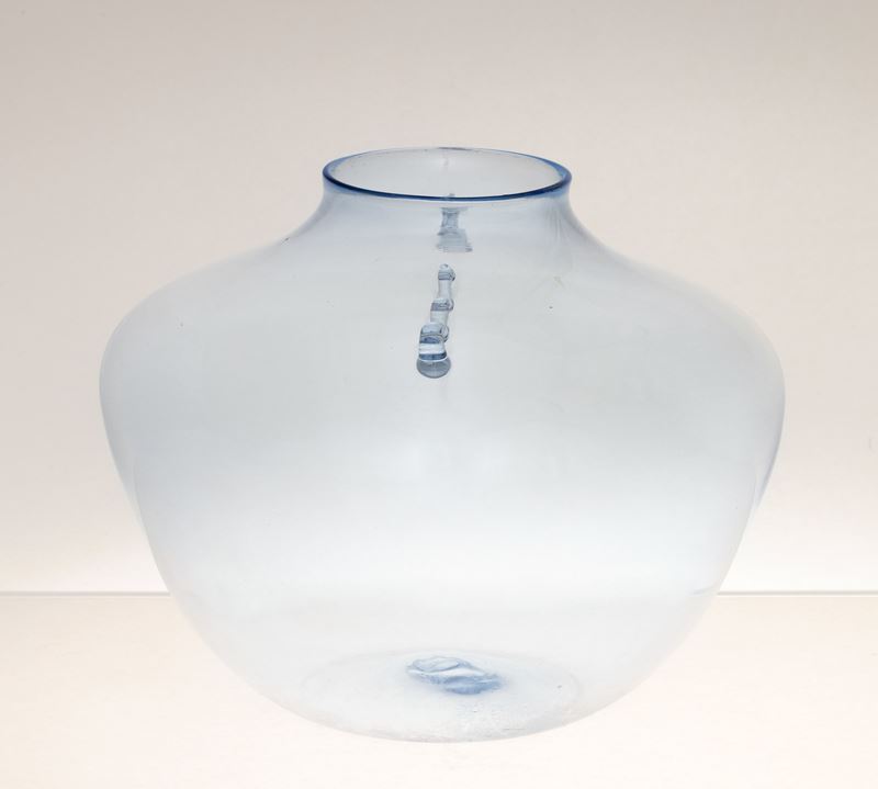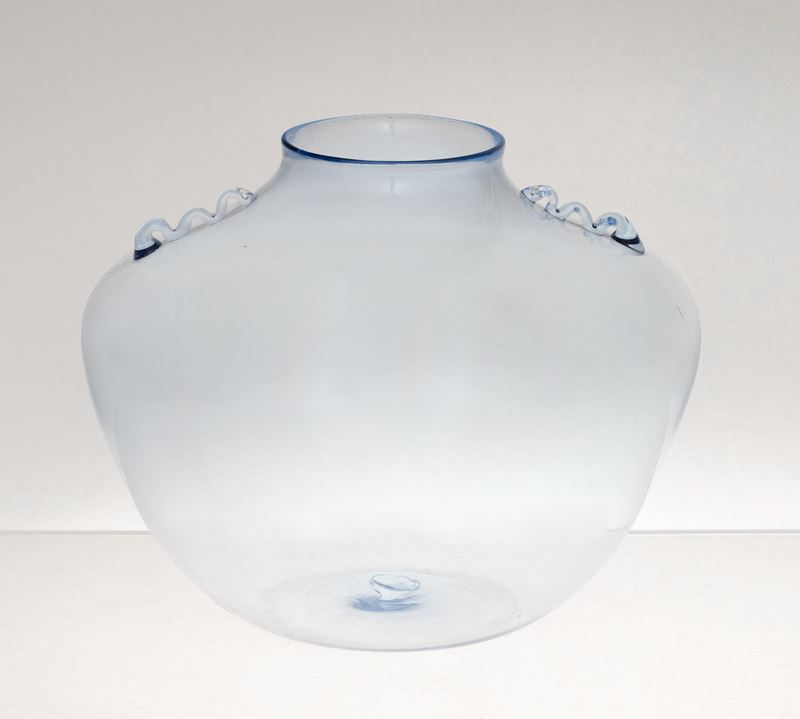 Vaso a sfera schiacciata con piccole anse applicate in vetro soffiato azzurrino.