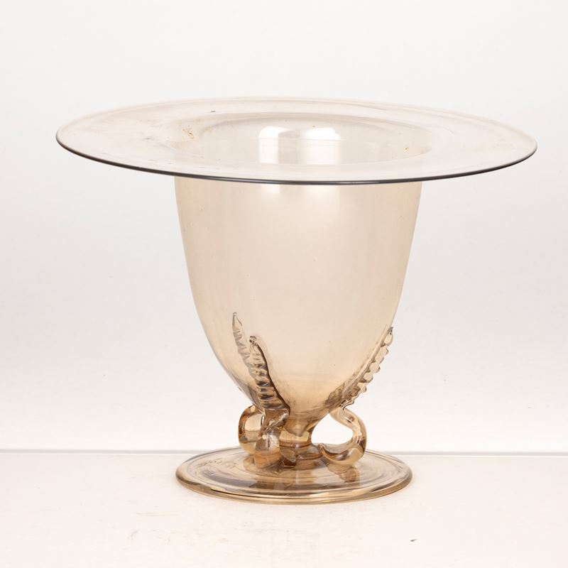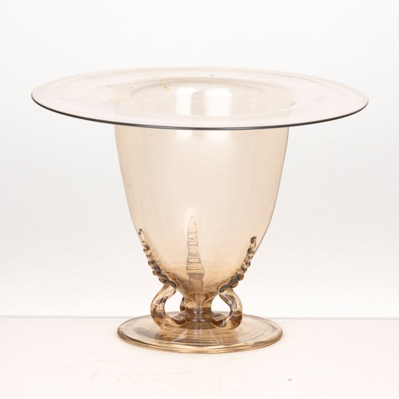 Vaso a campana in vetro soffiato pagliesco con bocca svasata, piede rotondo e tre anse a serpente applicate.