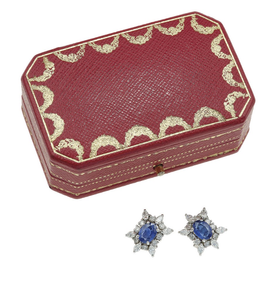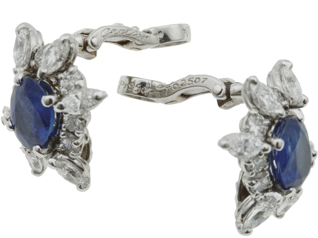 Cartier. Orecchini con zaffiri Sri Lanka di ct 1.30 e 1.40 circa e diamanti taglio navetta e brillante a contorno
