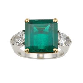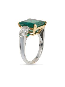 Cusi. Anello con smeraldo Colombia di ct 7.10 stimati e due diamanti taglio goccia per ct 1.65 stimati