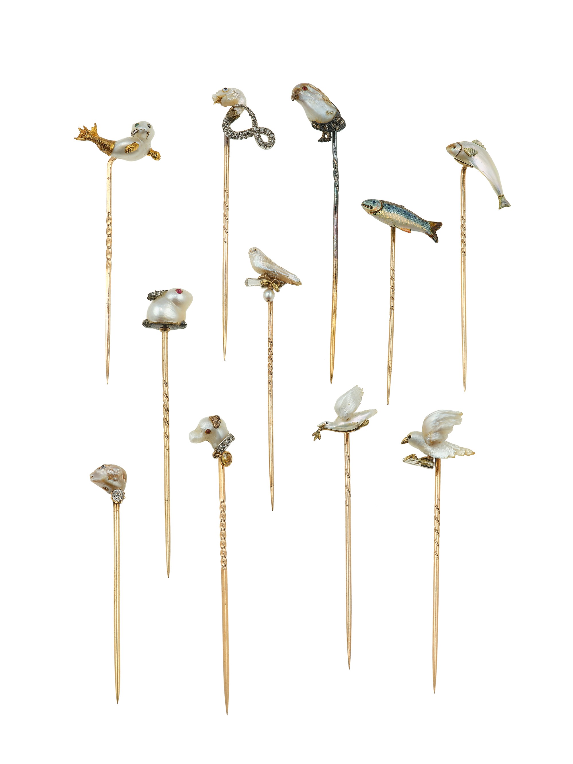 Lotto composto da 11 spilloni in oro, argento, perle, smalti e diamanti