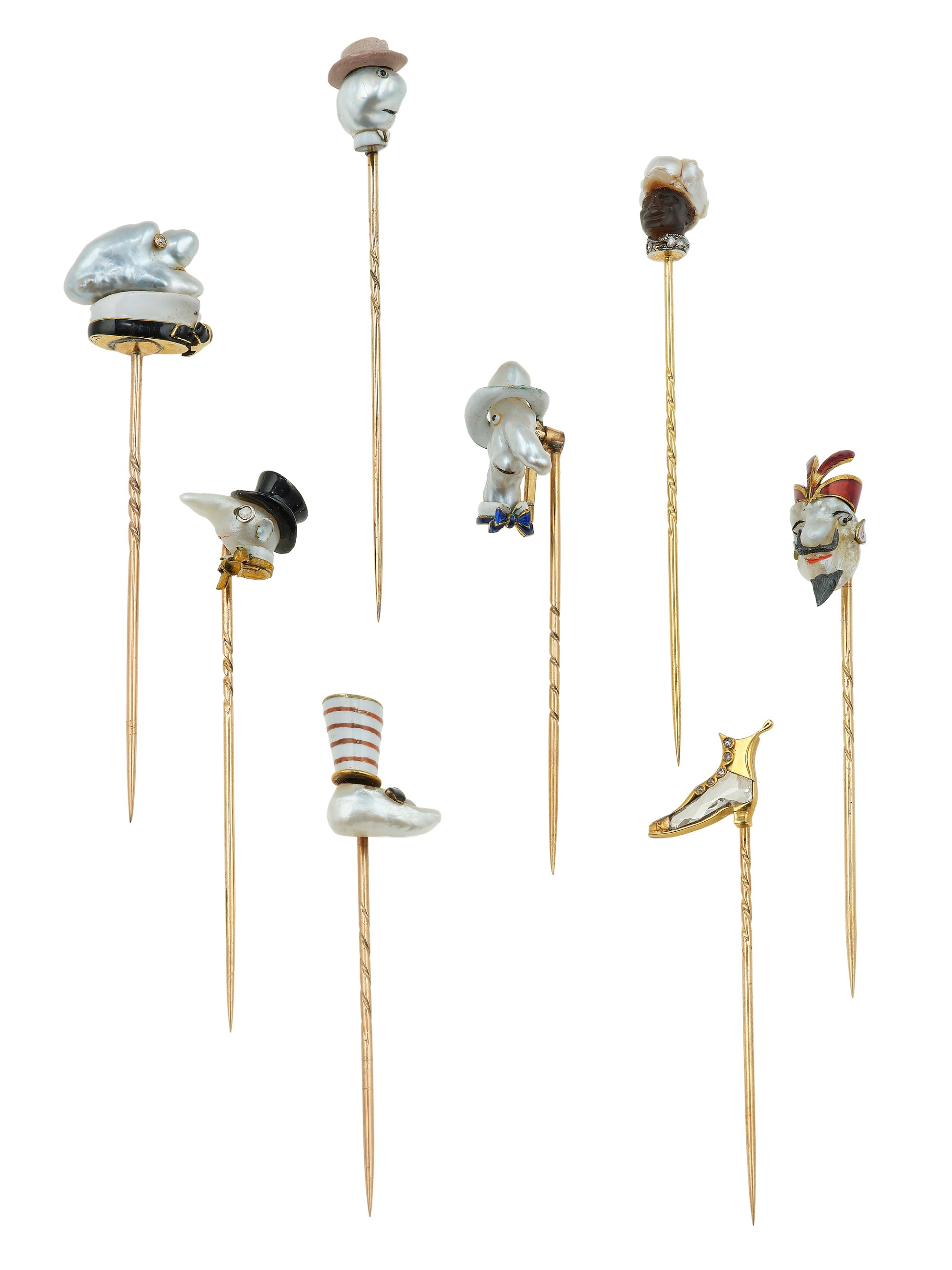 Lotto composto da 8 spilloni in oro, argento, perle, smalti e diamanti