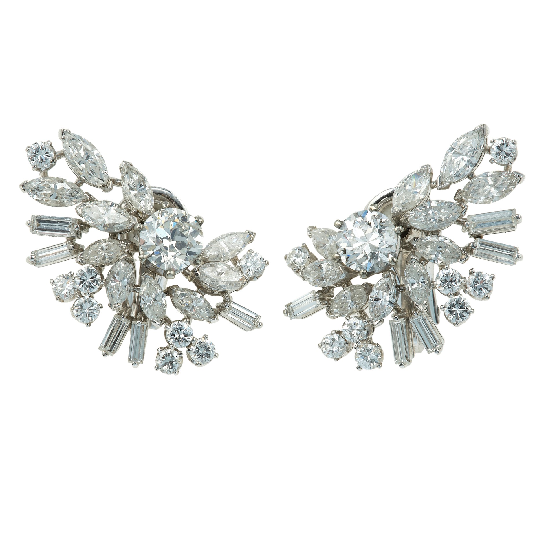 Orecchini con diamanti di vecchio taglio centrali e diamanti taglio navetta, baguette e brillante a contorno