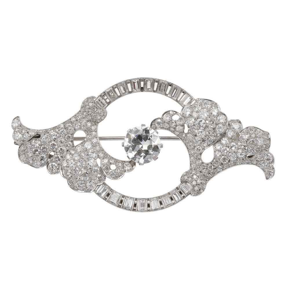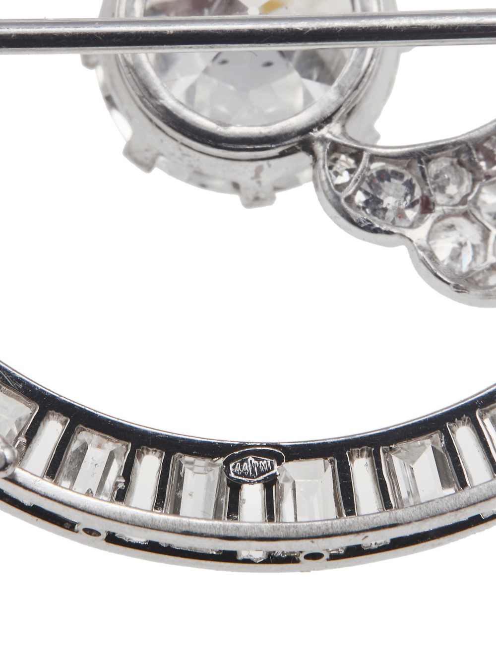 Ravasco. Spilla con diamanti taglio rotondo e baguette, diamante centrale, taglio circular, di ct 2.80 stimato