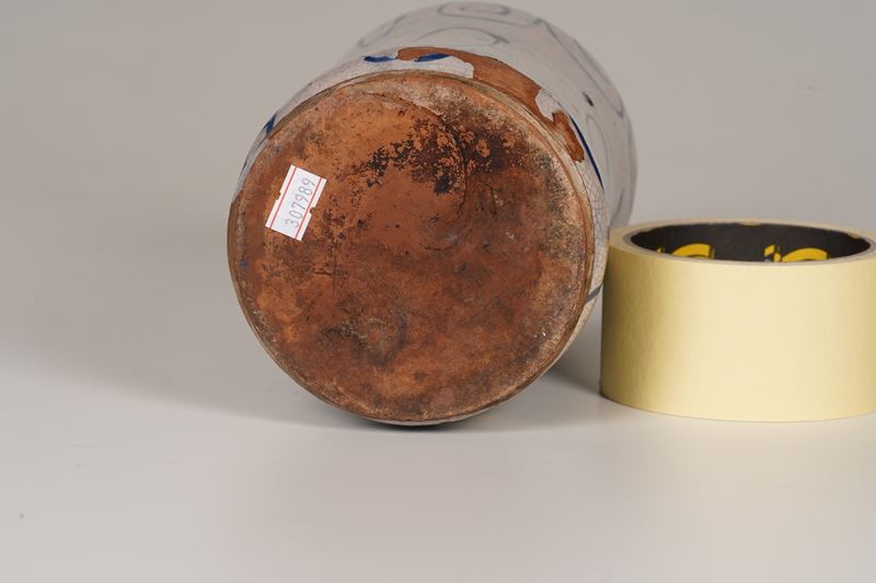 Albarello da farmacia, di forma cilindrica slanciata e leggermente rastremata nella zona mediana, dotato di basso piede ad orlo profilato e di alta bocca estroflessa. Sulla zona frontale, all’interno di un medaglione circolare, delimitato da un festone, è dipinto uno scudo araldico a testa di cavallo, tagliato orizzontalmente da un cartiglio con la scritta farmaceutica “ZV°. VIOLATO”, e ornato ai lati da sottili nastri, ripresi in larghe spirali anche sul retro dell’opera. Dipinto in arancione e blu.