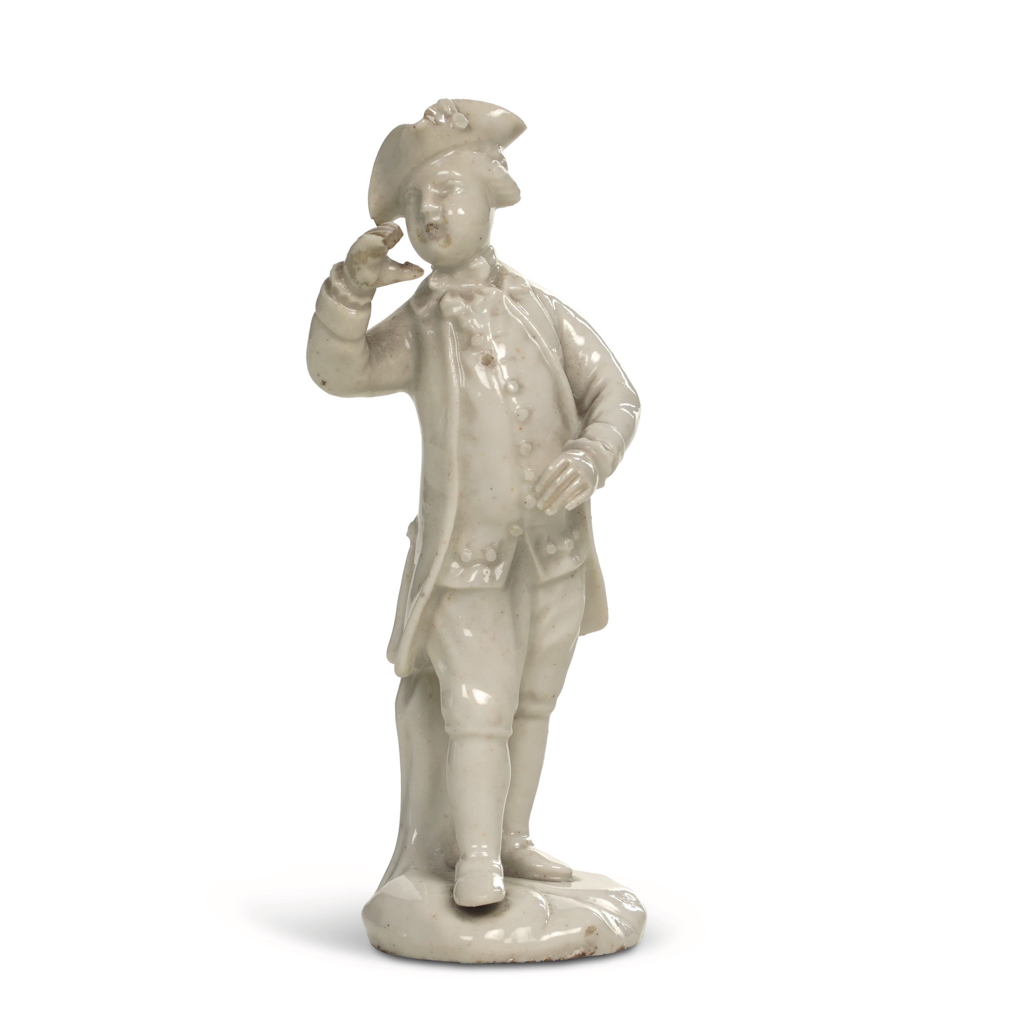 Porcellana. Marca: assente. Altezza cm 12,3. Conservazione: buona; piccole mancanze alle dita della mano destra e al bordo del tricorno.