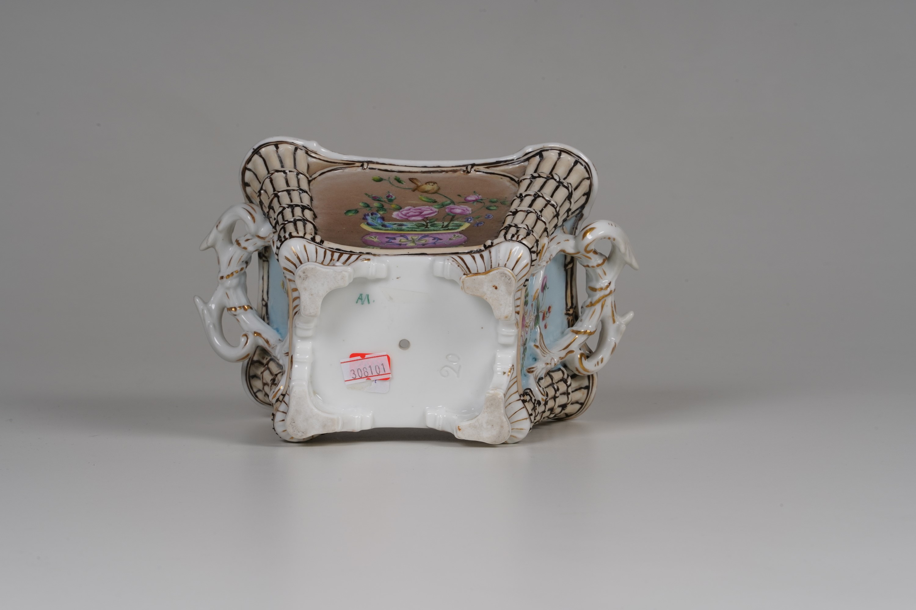 Raro vaso da fiori dalla forma rettangolare arrotondata agli angoli ed estroflessa verso l’alto che poggia su quattro piedi. La decorazione policroma e in oro vede sul fronte e sul retro un raffinato motivo a gabbietta con due pappagalli e rispettivamente un vaso di fiori su cui si posa un uccellino. Sui lati minori è dipinto un vaso a rocailles con steli fioriti. A lati del vaso elaborati manici a rocailles vegetali e ai quattro spigoli motivo a colonne ad imitazione del vimini