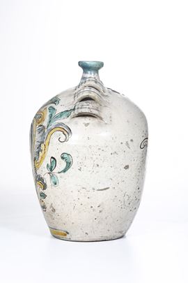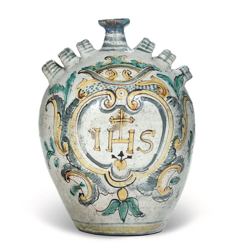 Fiasca da pellegrino decorata in policromia a gran fuoco con grande cartiglio, dominato da una specie di corona, con il Sacro Cuore trafitto da tre frecce e sormontato dal simbolo cristologico “IHS” con la “h” crucifera, compendium del nome di Gesù in grafia greca o trigramma bernardiniano