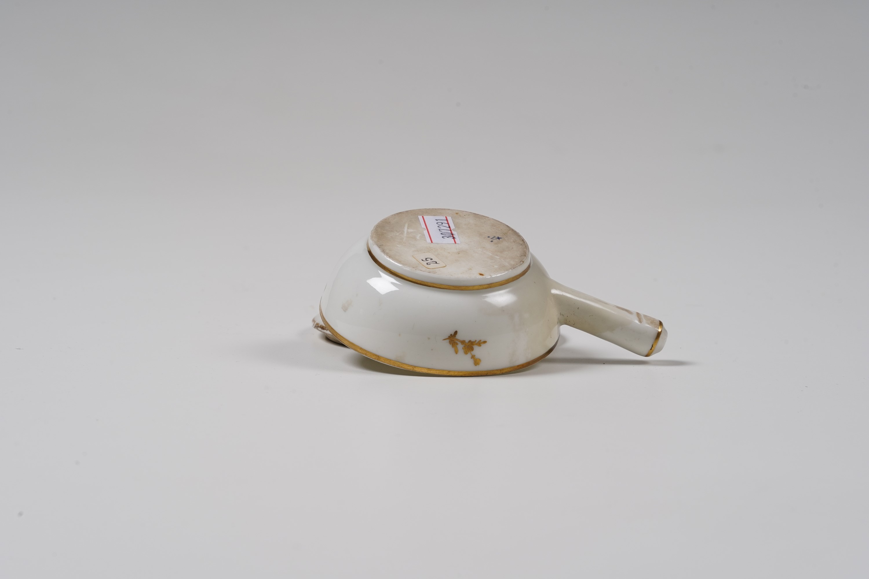 Il padellino, dalla tipica presa del coperchio modellata a fruttino fogliato, presenta il manico in porcellana che spesso era invece eseguito in legno. La decorazione vede steli fioriti e fogliati sparsi dipinti in oro