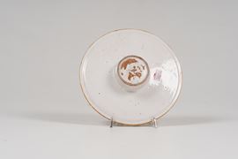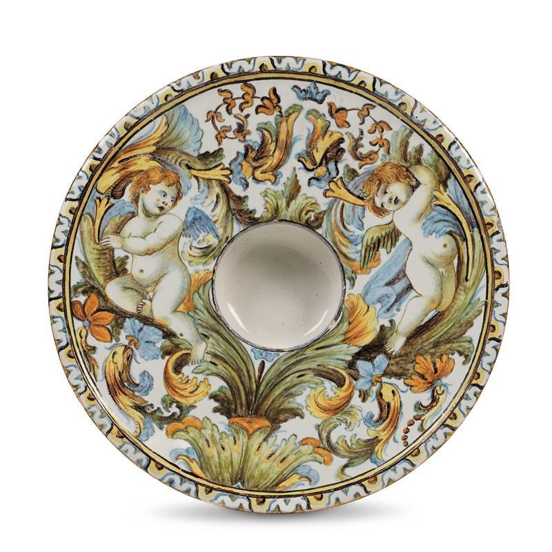 Piattino trembleuse, con sede circolare centrale per la tazzina, decorato con due putti giocosi tra girali fogliate. La formula decorativa riprende quella adottata nelle tese da Carlo Antonio Grue