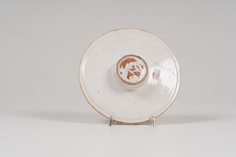 Maiolica decorata in policromia a gran fuoco. Diametro cm 18. Conservazione: rottura al bordo tra le ore 11 e le ore 13 ricomposta in restauro e visibile sul verso; restauri e rifacimenti alla sede centrale per la tazzina.