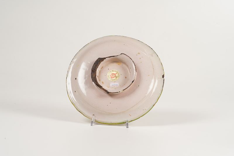 Maiolica. Diametro cm 25. Conservazione: mancanze al piede; piccole sbeccature al bordo