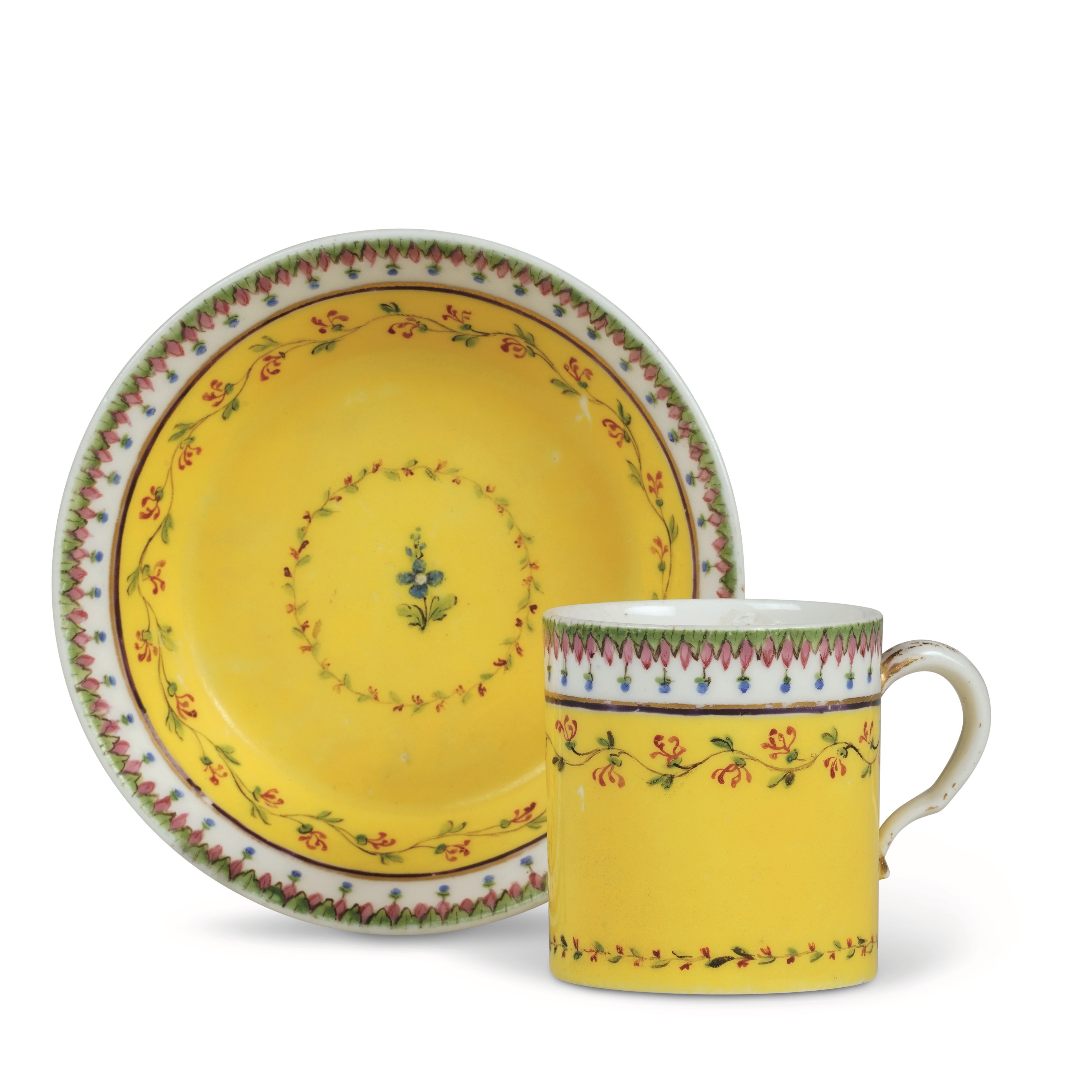 Tazza cilindrica dal manico ad orecchio con piattino troncoconico. Sia la tazza che il piattino sono decorati a nastri con motivi vegetali stilizzati su fondo giallo