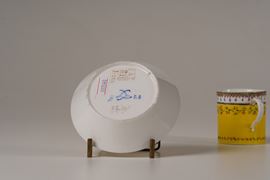 Porcellana policroma. Marca: “L” intrecciate e lettere data “jj”; contrassegno del pittore “RB”. Dimensioni: altezza tazza cm 6; diametro piattino cm 11,8. Conservazione: piccole usure all'oro.