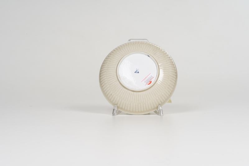 La tazza con il manico ad orecchio ed il piattino sono decorati sulle pareti interne in blu di cobalto sotto smalto con fiori stilizzati disposti simmetricamente. Ai bordi troviamo un nastro a graticcio interrotto da quattro riserve con fiorellini. Le superfici esterne di color crema sono decorate con il motivo a coste sfalsate in rilievo detto “Gebrochener Stab”.