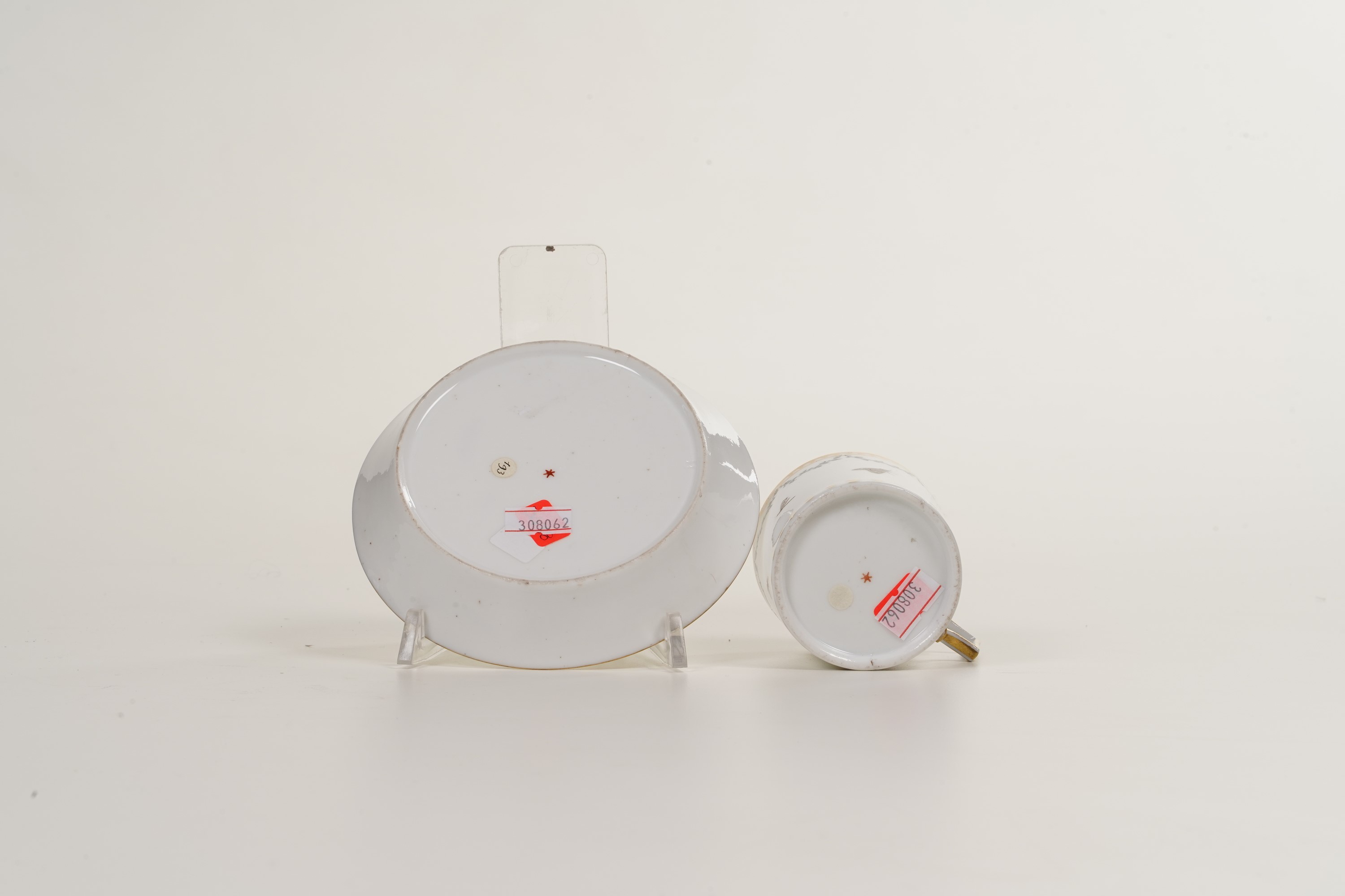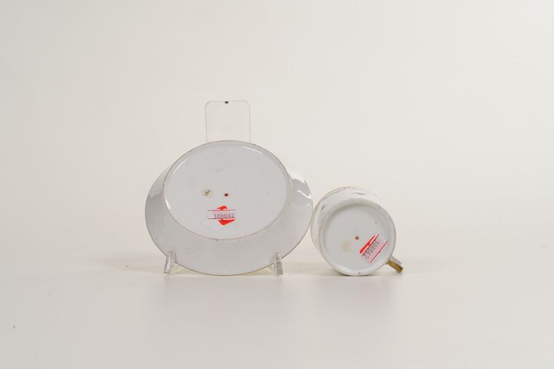 Porcellana. Marca: stella in rosso. Dimensioni: altezza tazza cm 6; diametro piattino cm 13. Conservazione: ottima.