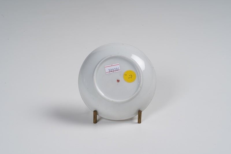 Sulla parete esterna della tazza e nel cavetto del piattino è dipinto, in policromia e oro, uno stemma araldico coronato. Inoltre sulla parete esterna della tazza decorazione geometrica a rombi alternata a riserve con reticolo di fiori. Ai bordi interni fregi in rosso.
