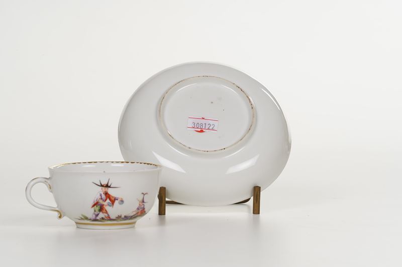 Porcellana. Marca: assente. Dimensioni: altezza tazza cm 4,1; diametro piattino cm 12,4. Conservazione: minima sbeccatura al bordo superiore della tazza; insignificanti usure all’oro.