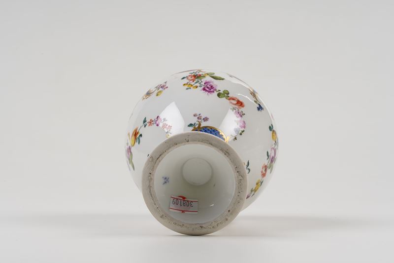 Il vaso dalla forma a balaustro deriva da un modello della manifattura francese di Vincennes detto “Pompadour”. E’ decorato in policromia e oro a ghirlande di fiori tra due fasce “a squame” in blu contornate da rocailles in oro