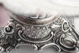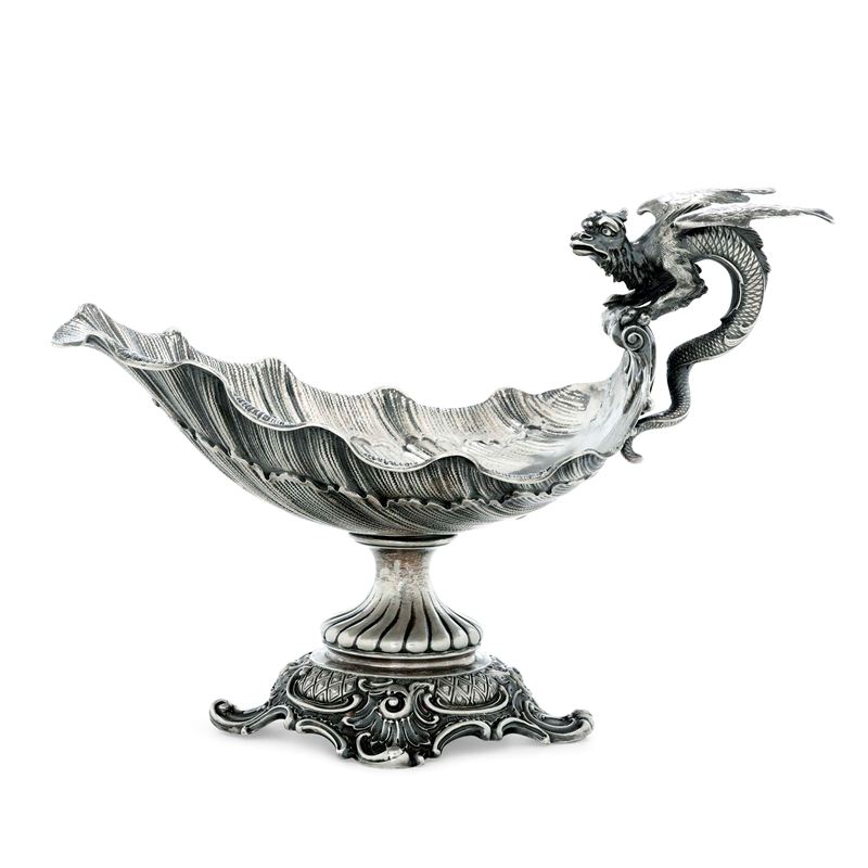 Alzata a foggia di conchiglia con ansa raffigurante drago. Manifattura tedesca, inizi del XX secolo