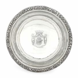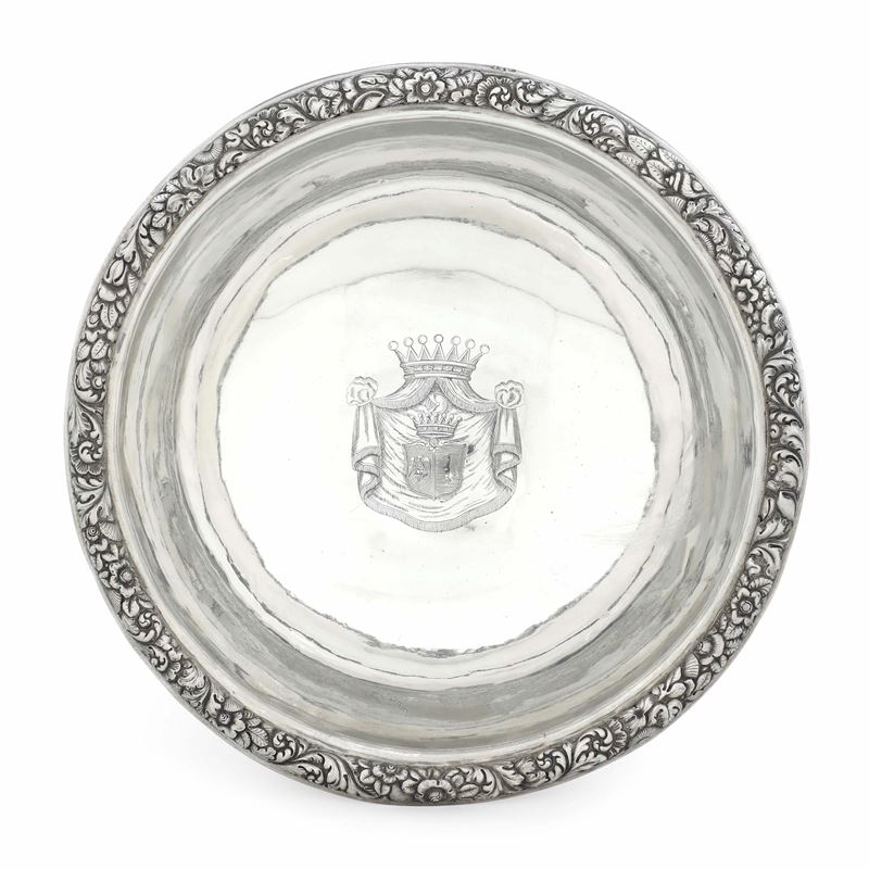 Forma circolare con bordo decorato a motivi vegetali e raffinata incisione al centro del cavetto con importante stemma nobiliare sormontato da corone