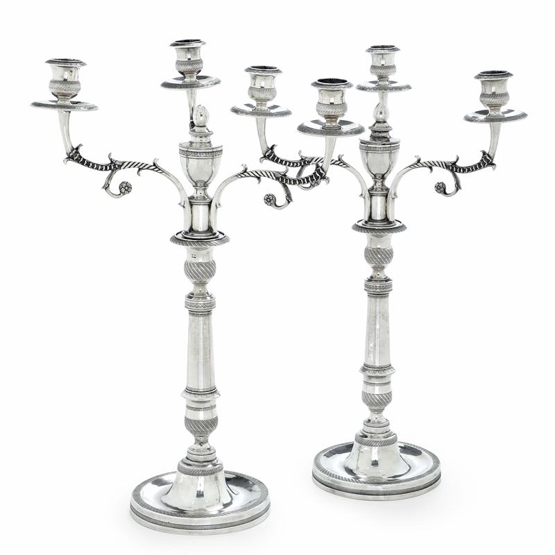 Coppia di candelabri a quattro fiamme. Napoli, prima metà del XIX secolo. Saggiatore Paulo De Blasio (1825-1832). Argentiere Gennaro Romanelli (1809-1840)