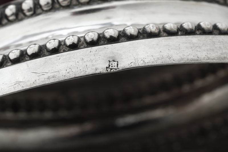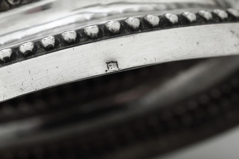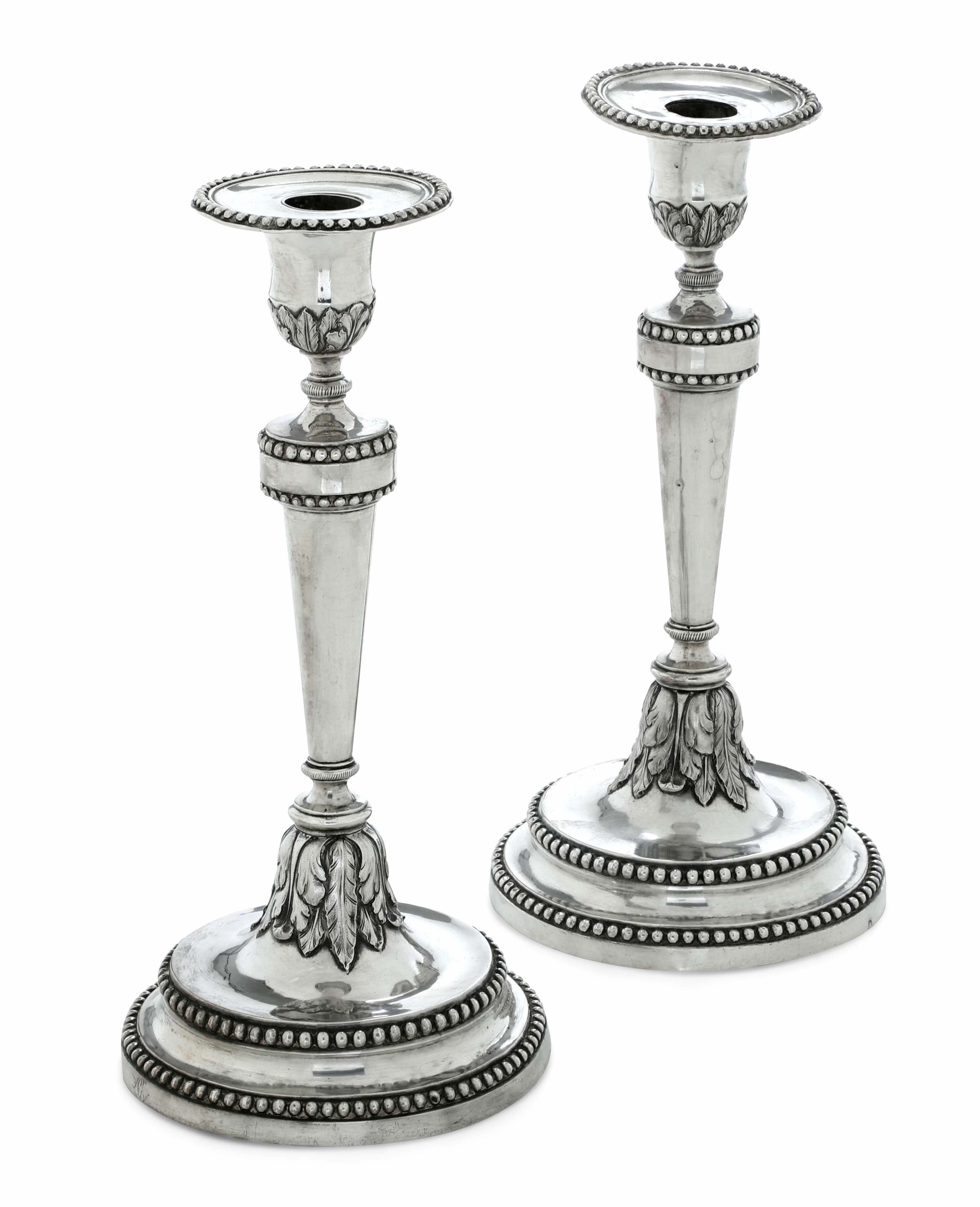 Coppia di candelieri neoclassici. Genova, fine del XVIII secolo. Marchio della "Torretta" per l'anno (1)787 ? (marchio parziale di difficile lettura)