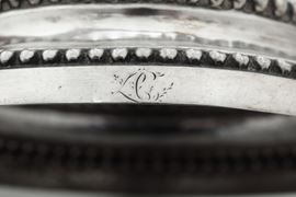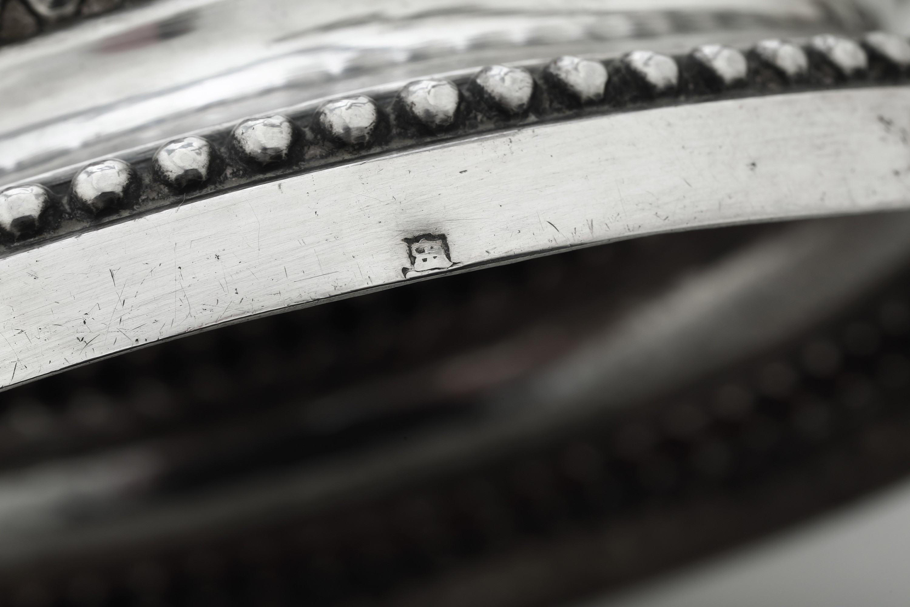 Base circolare gradinata e fusto conico con eleganti decori a perlinatura e fogliacei. Alla base monogramma L C cesellato