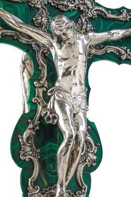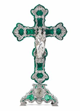 Croce da meditazione in argento e malachite. Pubblicata su: ARGENTIERI GEMMARI E ORAFI D'ITALIA" di Costantino G Bulgari, Edizione Fratelli Palombi, Roma 1980, pagina 529 e pagina 542, tav 34 come Giovanni Giardini ma possibile opera del XX secolo