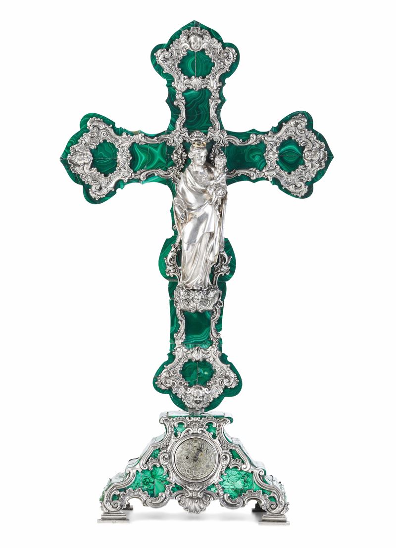 L'importante opera, significativo esempio della raffinata produzione orafa romana per le prestigiose committenze vaticane, è realizzata con lastre sagomate di preziosa malachite incorniciare e trattenute da una struttura a riserve in argento sbalzato e cesellato con motivi a volute e cartouches scandite da teste di cherubini.