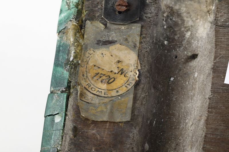 L'opera reca, in parte danneggiata, l'etichetta cartacea "Collezione Bulgari - Roma" al cui centro si identifica ancora vergata manualmente la datazione 1720 e altre parole frammentarie.