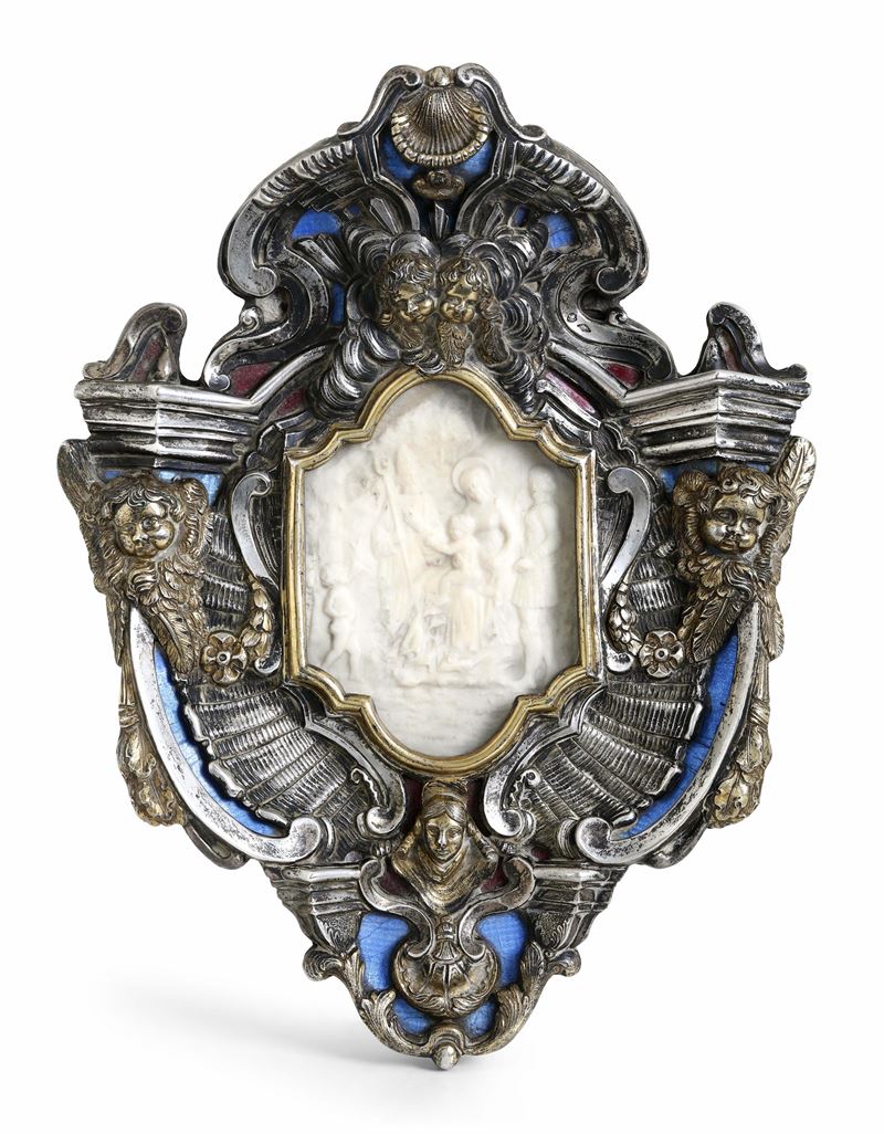 Foggia architettonica di gusto barocco riccamente ornata con elaborati motivi a volute, cartouches, conchiglie, teste di cherubini e mascheroni impreziositi da riserve contenenti smalti blu e rossi. Al centro entro cornice sagomata rilievo in cera di modello rinascimentale raffigurante Madonna con Bambino, San Giovannino, Santo Vescovo e offerente