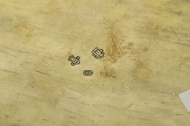 Corpo rettangolare sagomato poggiante su piedi a volute. Coperchio con decori fogliacei e raffinata incisione di due stemmi affiancati con aquila di Savoia e scudo sabaudo sormontati da corona