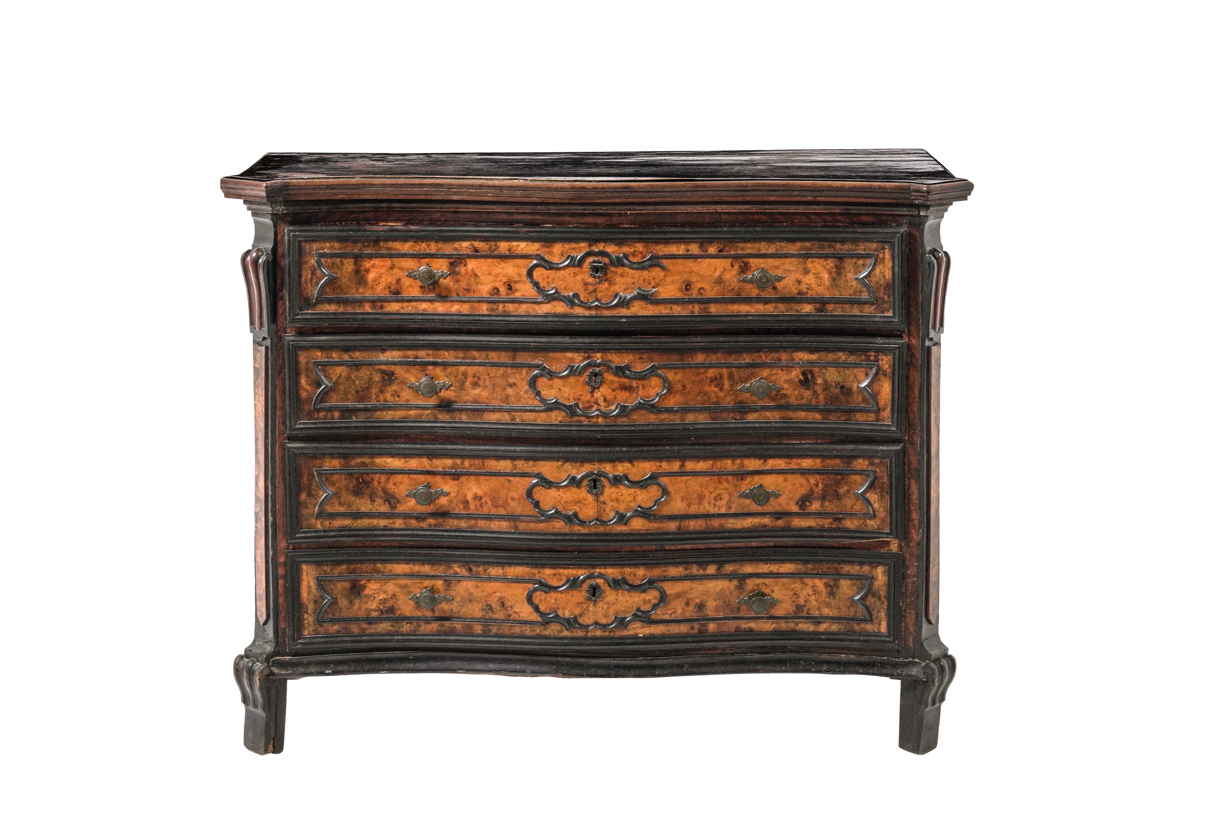 Lastronato in radica, fronte mosso a quattro cassetti decorati da riserve in legno ebanizzato, montanti e piedi intagliati