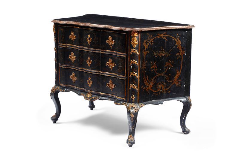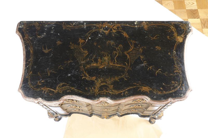 Legno laccato nero decorato a chinoiserie con elementi dorati. Fronte e fianchi mossi, gambe arcuate