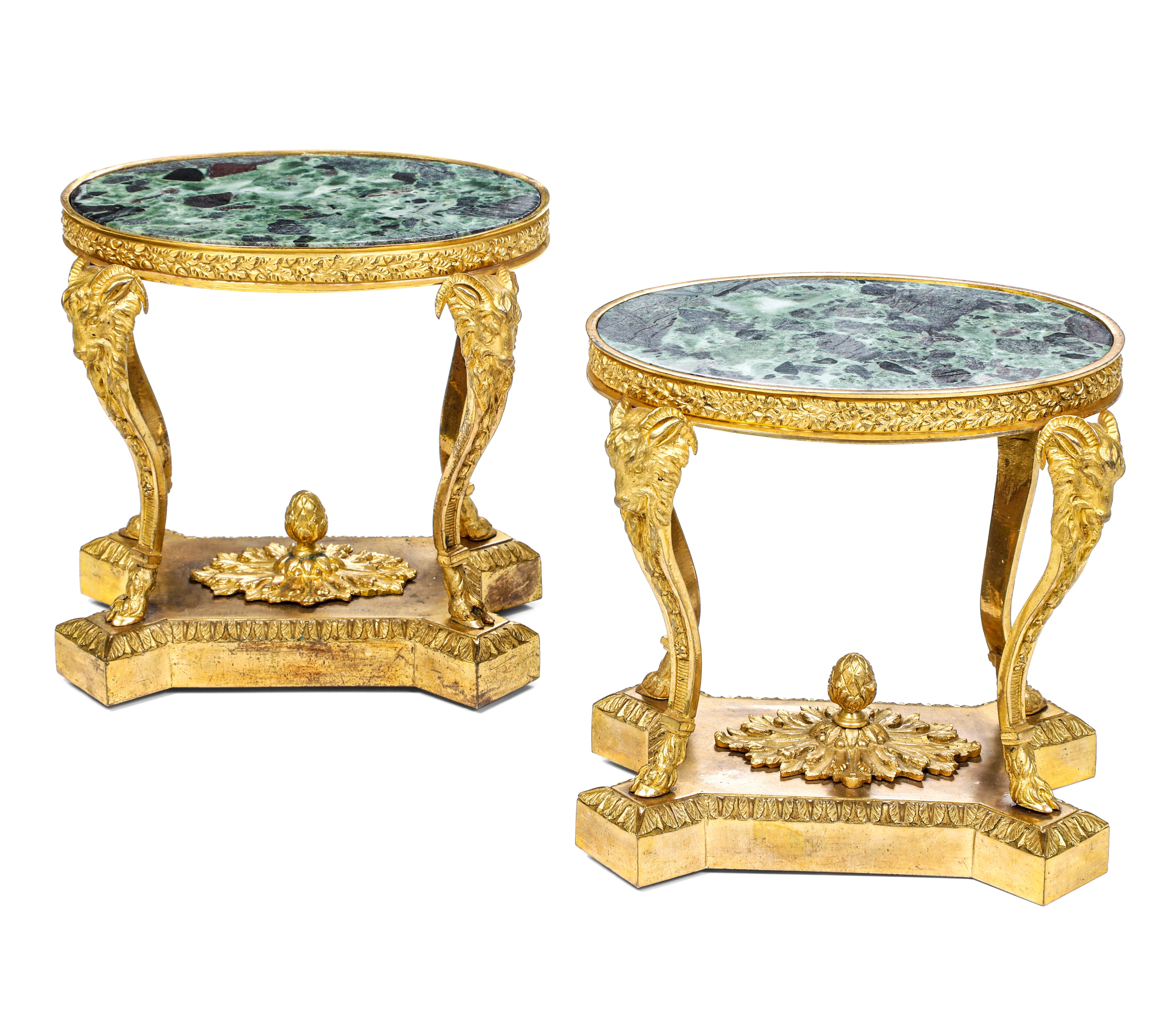Bronzo dorato e marmo serpentino, montanti cesellati a teste di ariete e piedi a zoccolo, base di linea spezzata con decoro a palmette centrata da elemento a pigna