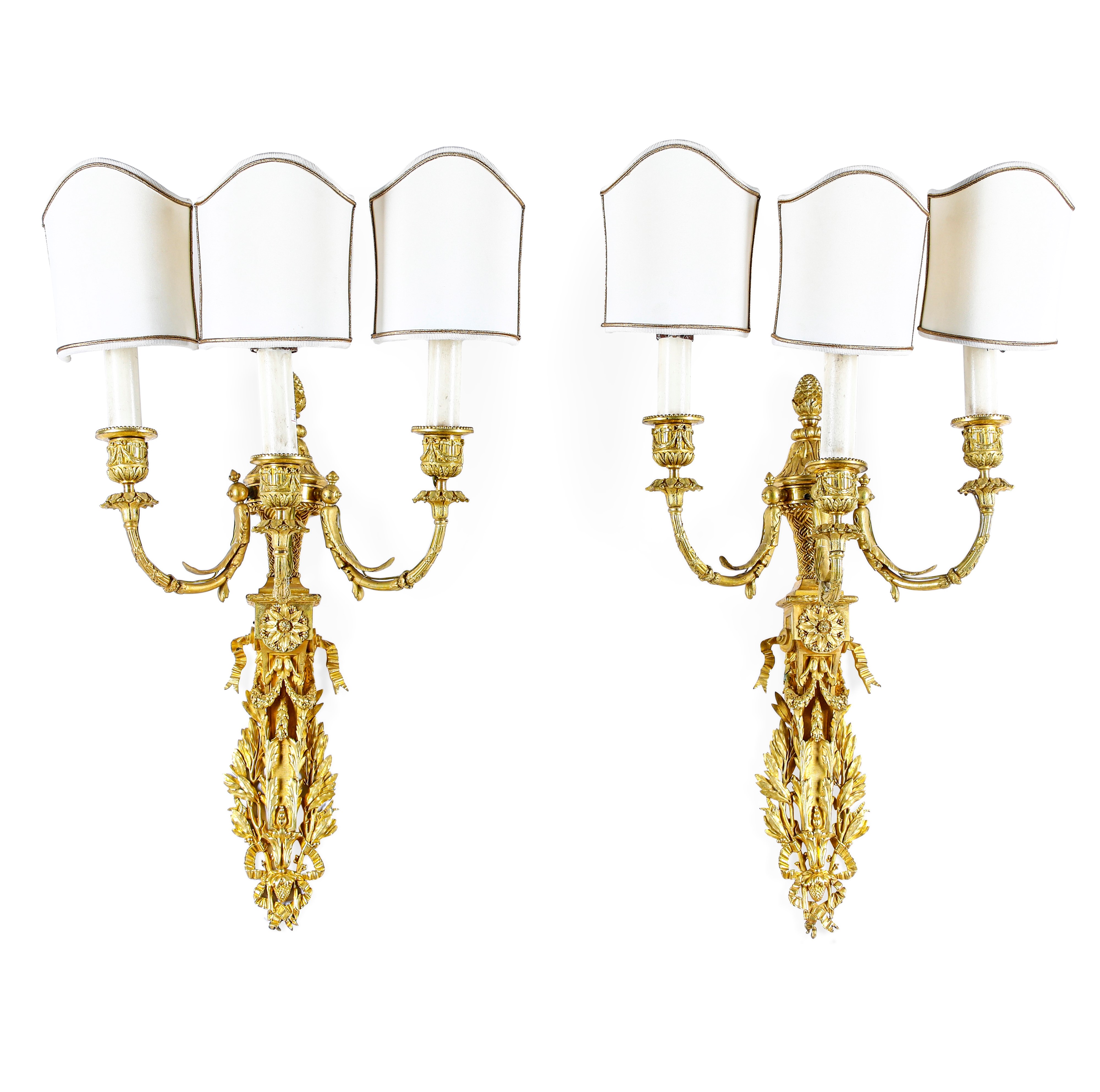 Coppia di appliques a tre luci in bronzo dorato e cesellato. XIX-XX secolo