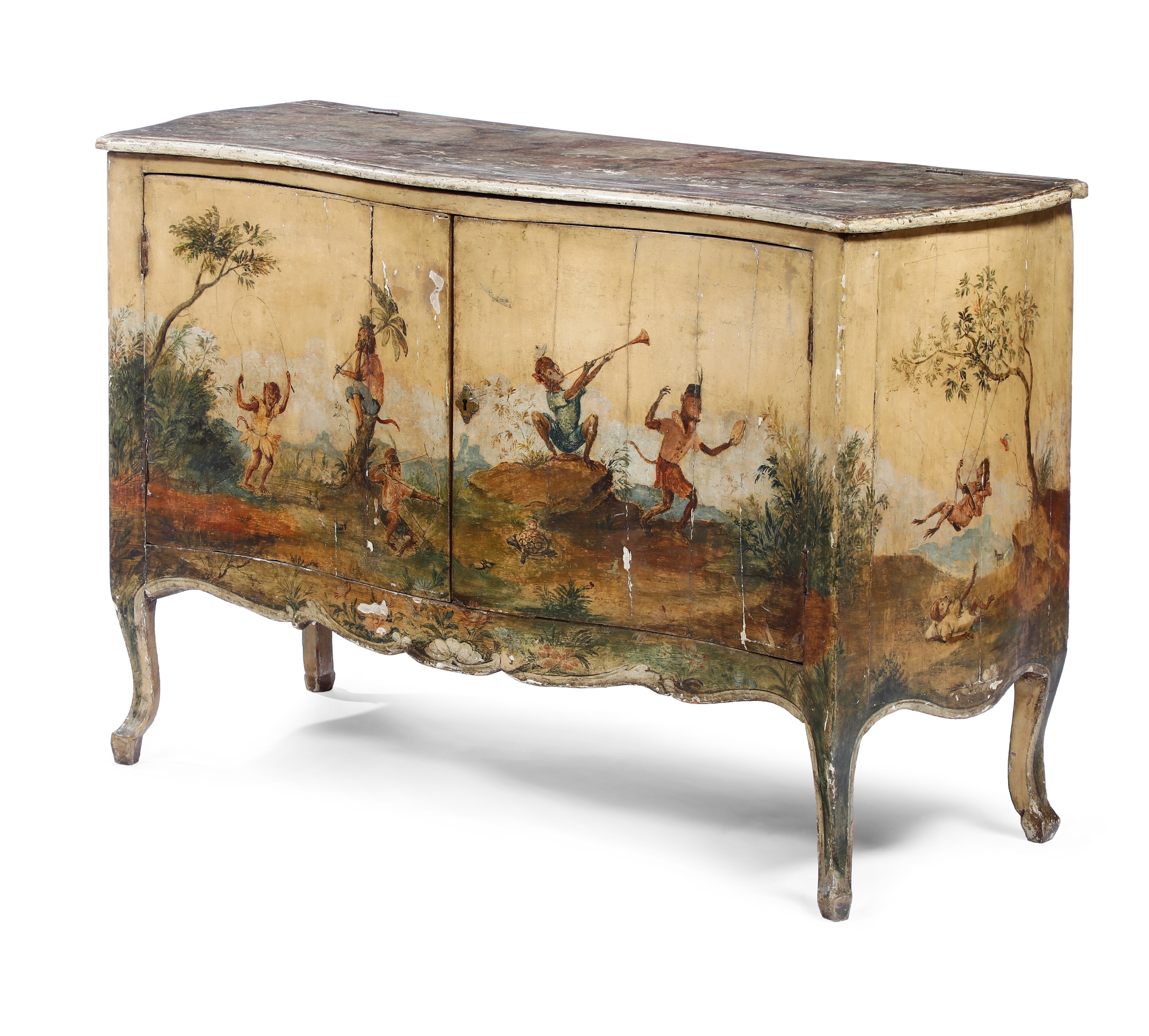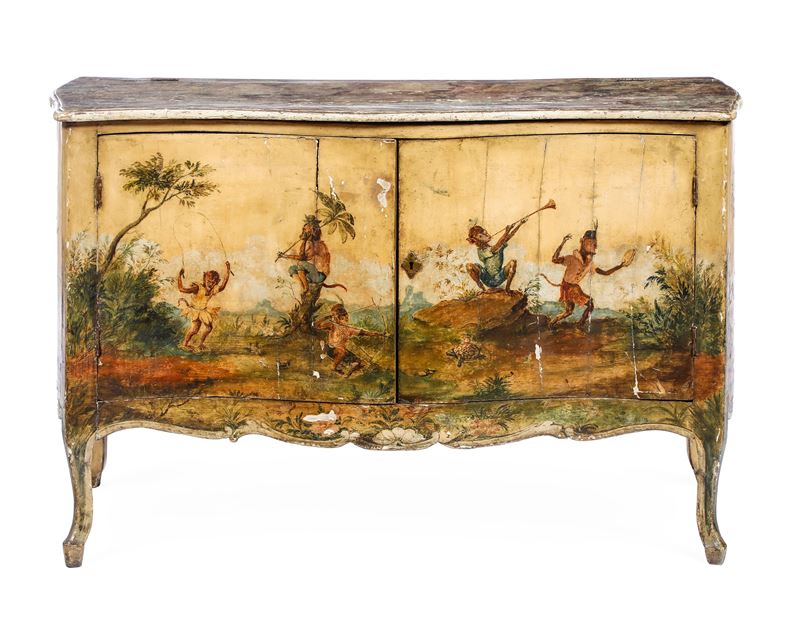 Decori di scimmie musicanti in un paesaggio, fronte mosso a due ante, piano laccato a finto marmo, piedi intagliati