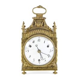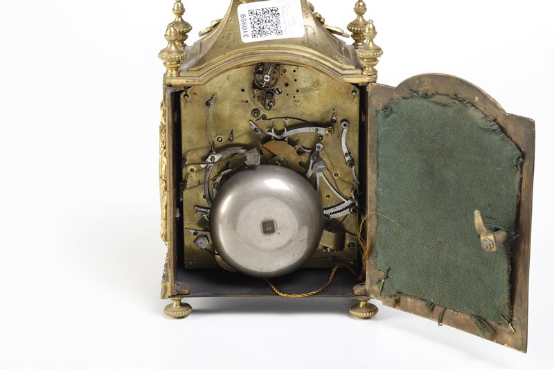 Cassa in bronzo con piedini a trottola, decoro a festoni e terminale a pigna, manico centrale