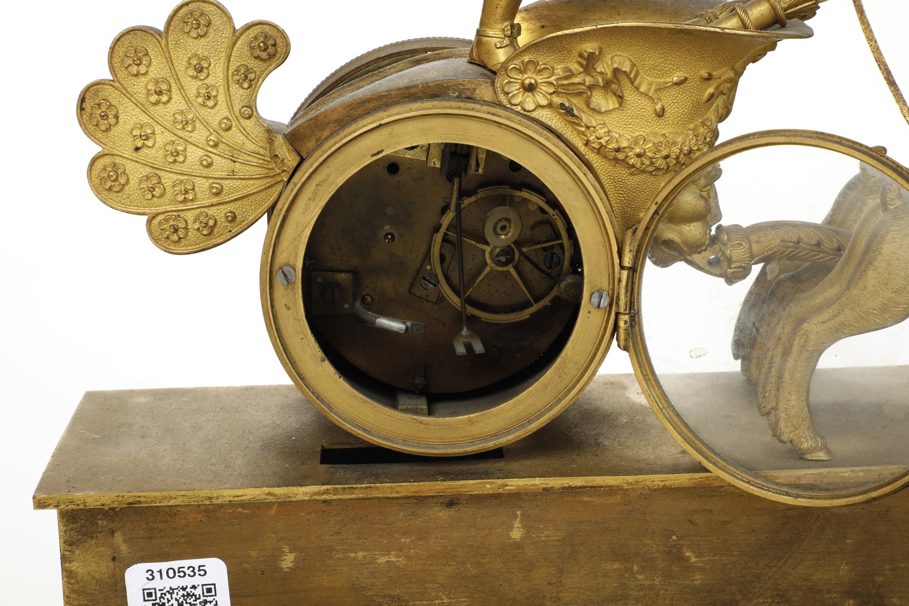 Cassa in bronzo dorato raffigurante Diana alla guida di una biga trainata da due cani da caccia, quadrante con numerazione romana a formare la ruota della biga, base decorata a palmette e panoplia in rilievo