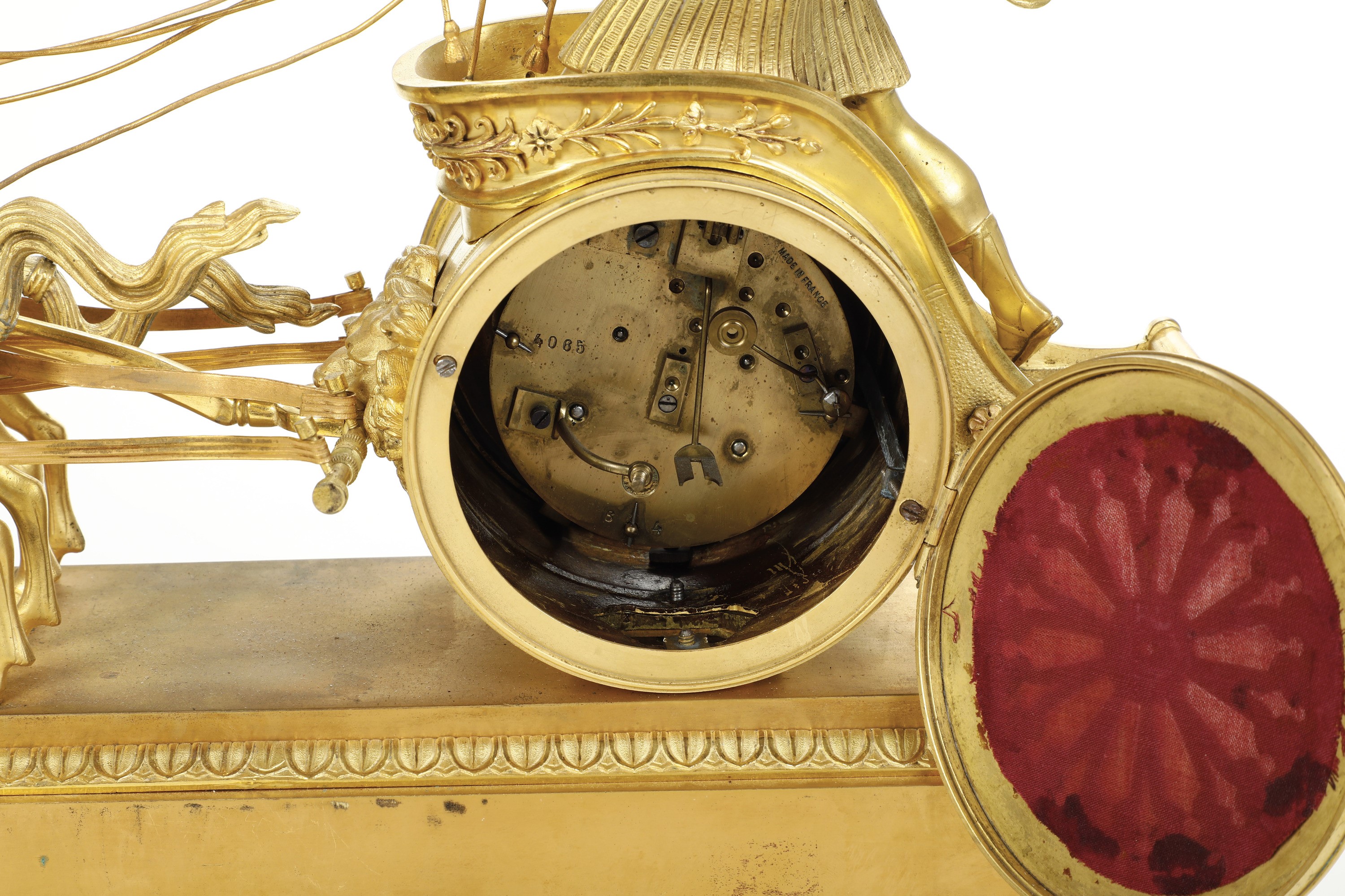Cassa in bronzo dorato raffigurante Apollo alla guida di una biga, base con rilievo cesellato a scena mitologica. Fascia oraria circolare smaltata a numerazione romana in nero per le ore