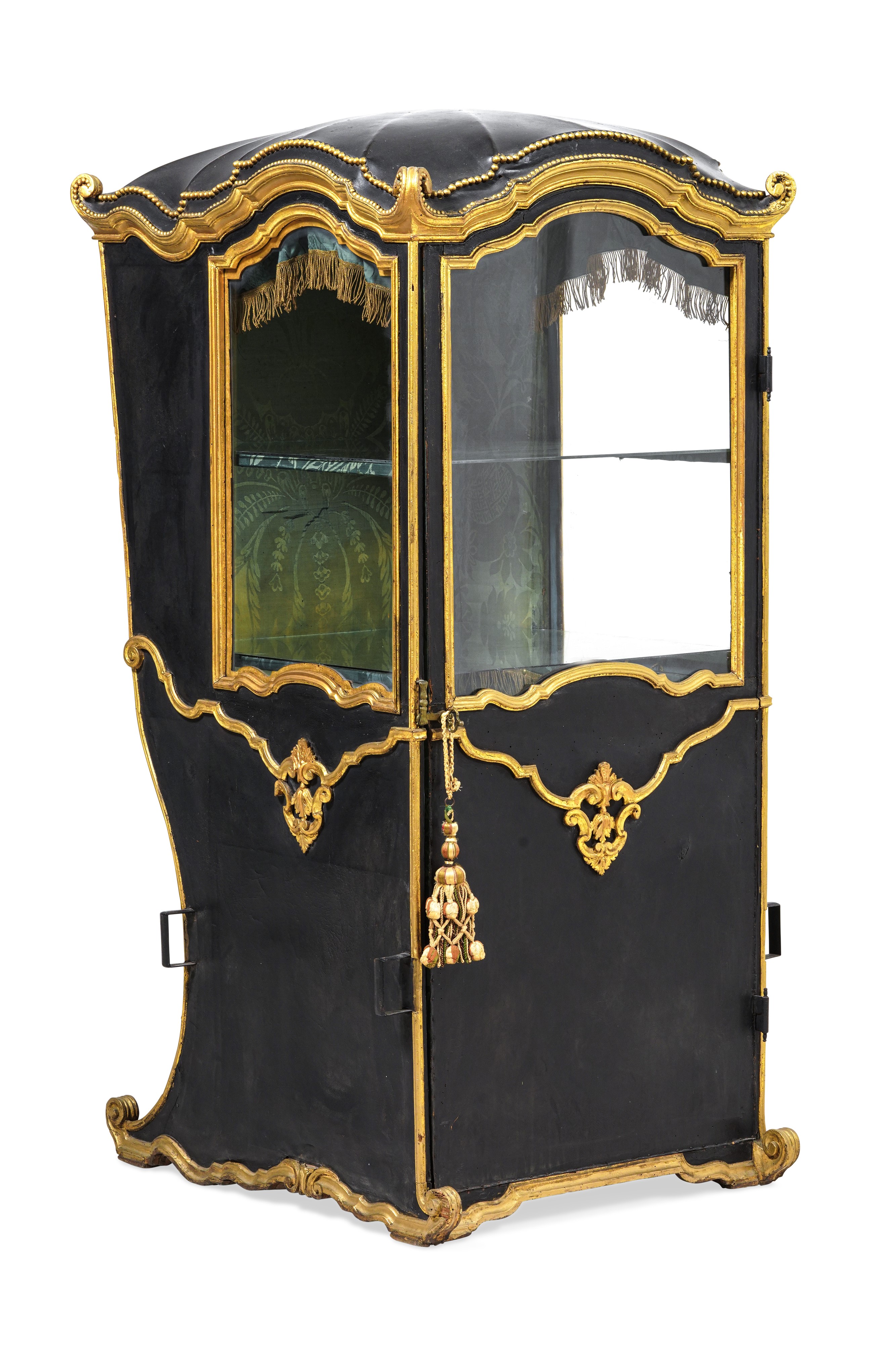 Pelle nera con profili e decori a pellacce in legno intagliato e dorato
